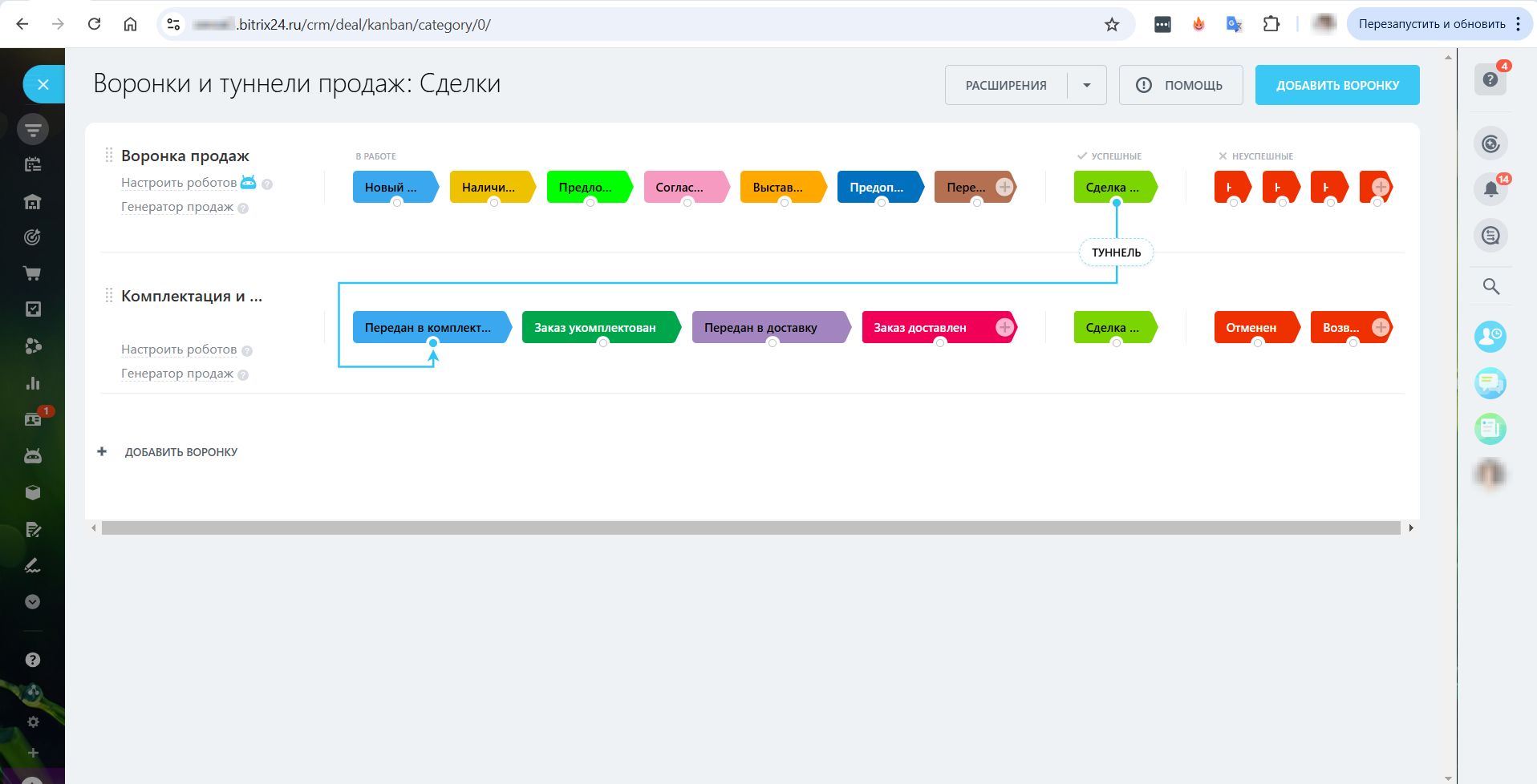 Воронка продаж поможет оценить эффективность вашего отдела продаж, а воронка Комплектация и доставка – эффективность службы доставки.