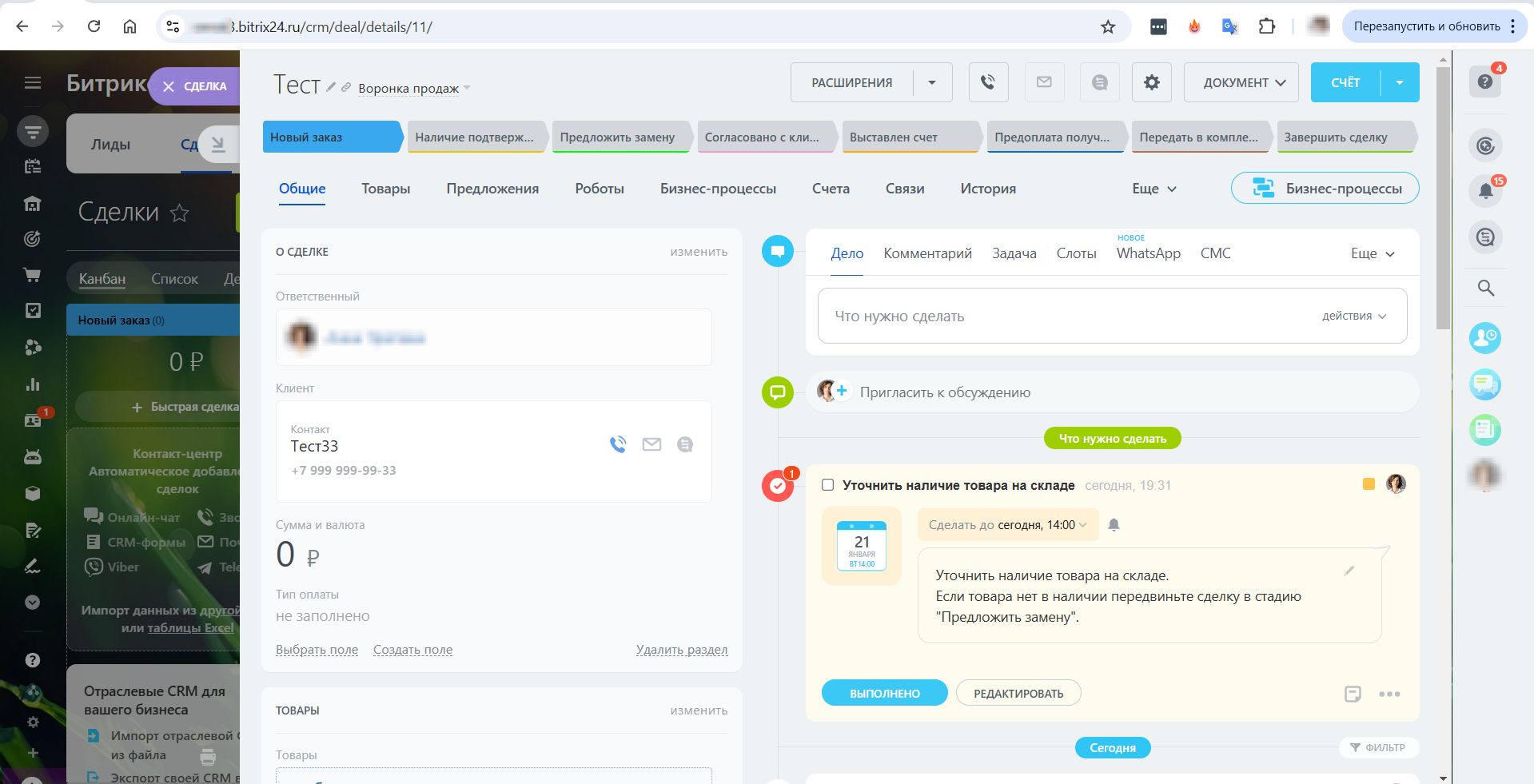 На стадии Наличие подтверждено в сделку добавляются дела «Уточнить детали заказа» и «Добавить товары в сделку». Если сделка остается на стадии дольше 3 дней, то руководителю отдела продаж ставится уведомление о контроле за сделкой.