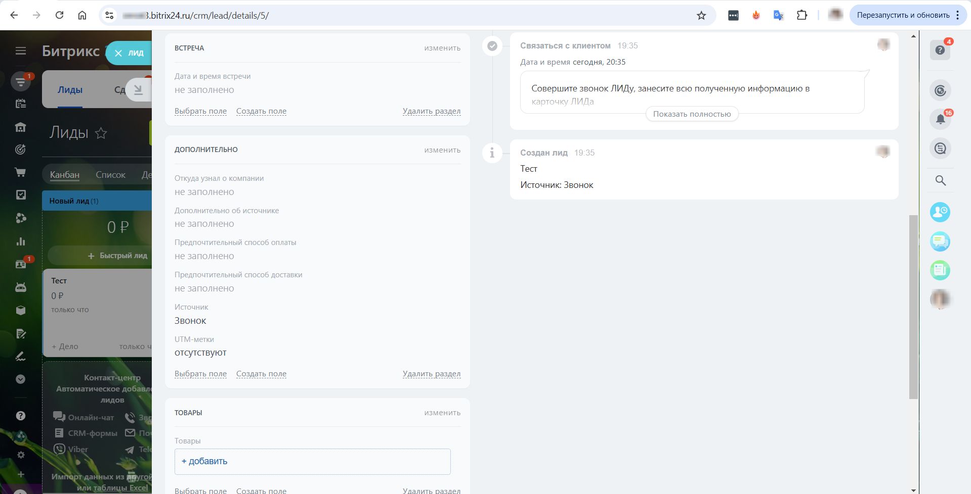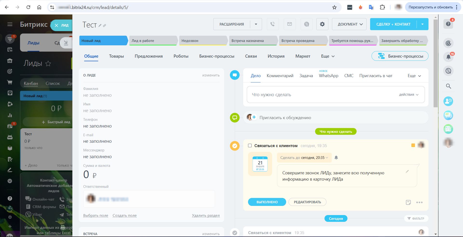 Через 1 день после того, как ЛИД попадет на стадию Встреча проведена, ответственному придет уведомление о необходимости заполнить поля в карточке ЛИДа.