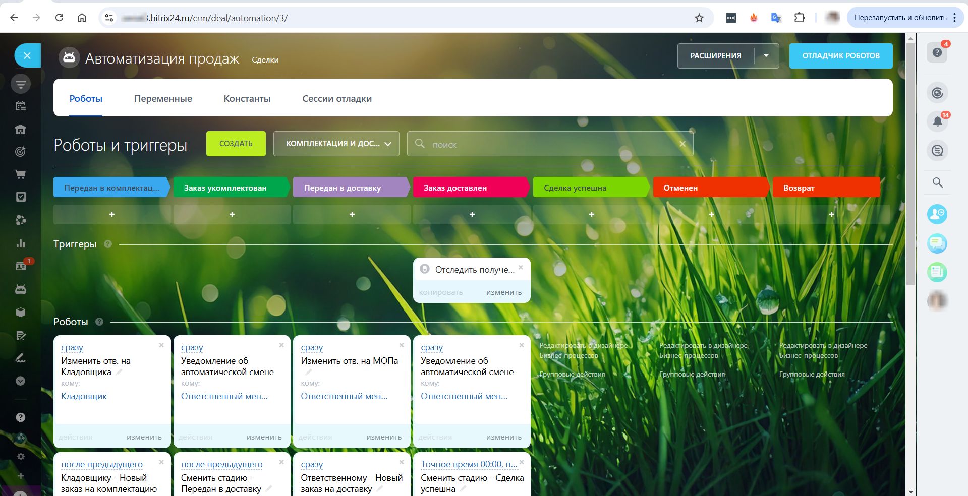 При переходе на стадию «Предоплата получена» автоматически ставится дело «Отправить заказ на комплектацию». После того, как сделка попадает на стадию «Передать в комплектацию» сделка автоматически копируется в воронку «Комплектация и доставка».