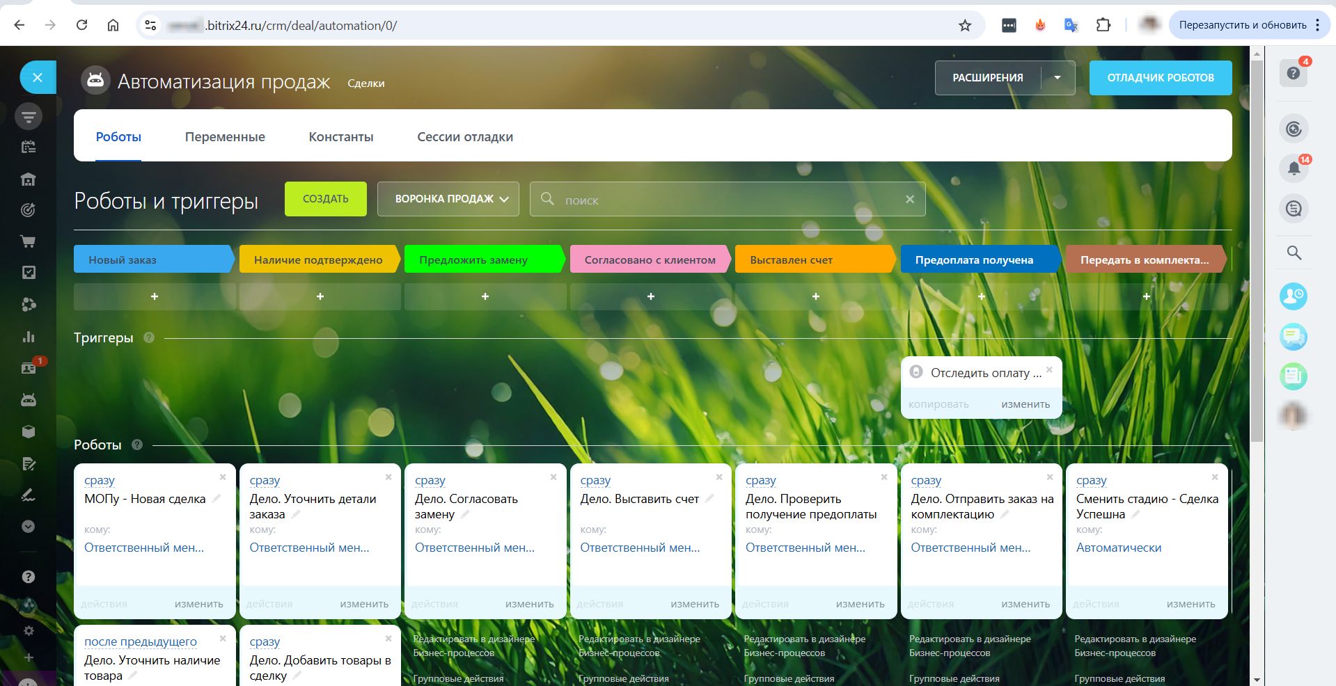 На стадии «Предложить замену» ответственному ставится дело «Согласовать замену». При переходе на стадию «Согласовано с клиентом» автоматически ставится дело «Выставить счет». При переходе на стадию «Выставлен счет» ставится дело «Проверить получение предоплаты».