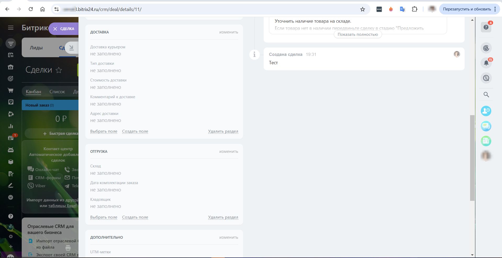 При переходе на стадию «Заказ укомплектован» автоматически заполняется Дата комплектации заказа, и сделка автоматически перемещается на стадию «Передан в доставку».