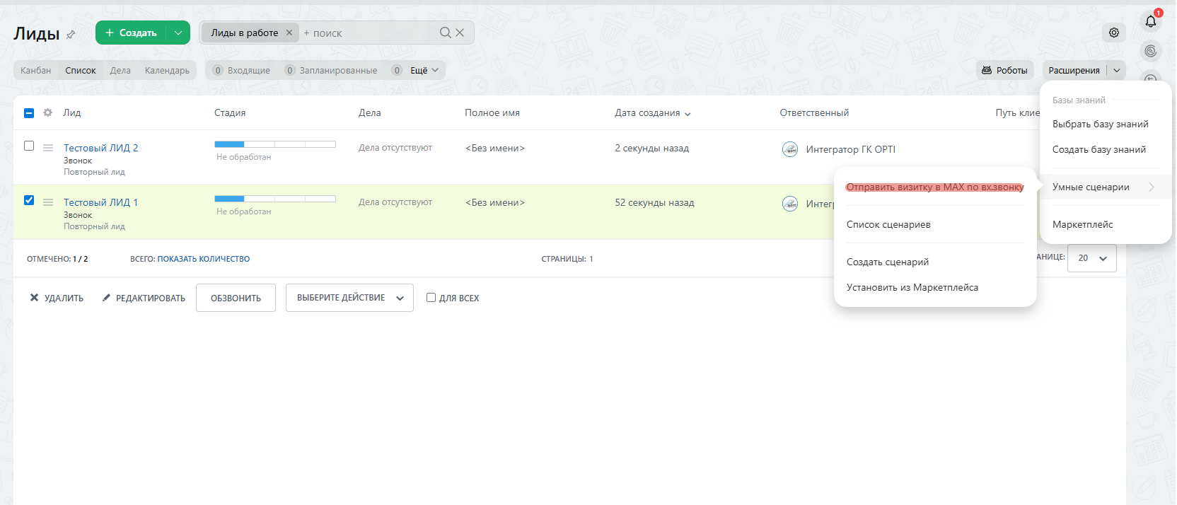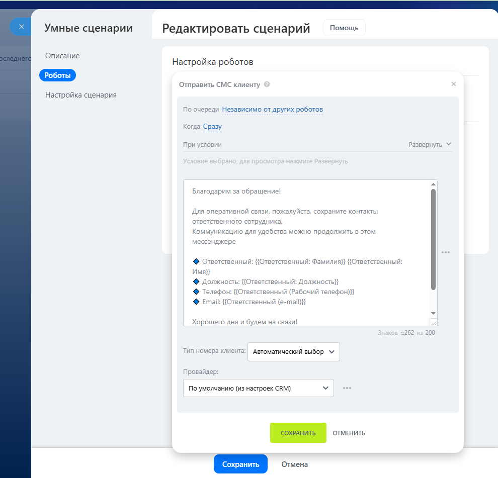 Настроенный сценарий автоматически отправляет клиенту готовый шаблон сообщения при условии, что источником обращения является звонок. Решение работает с ЛИДами