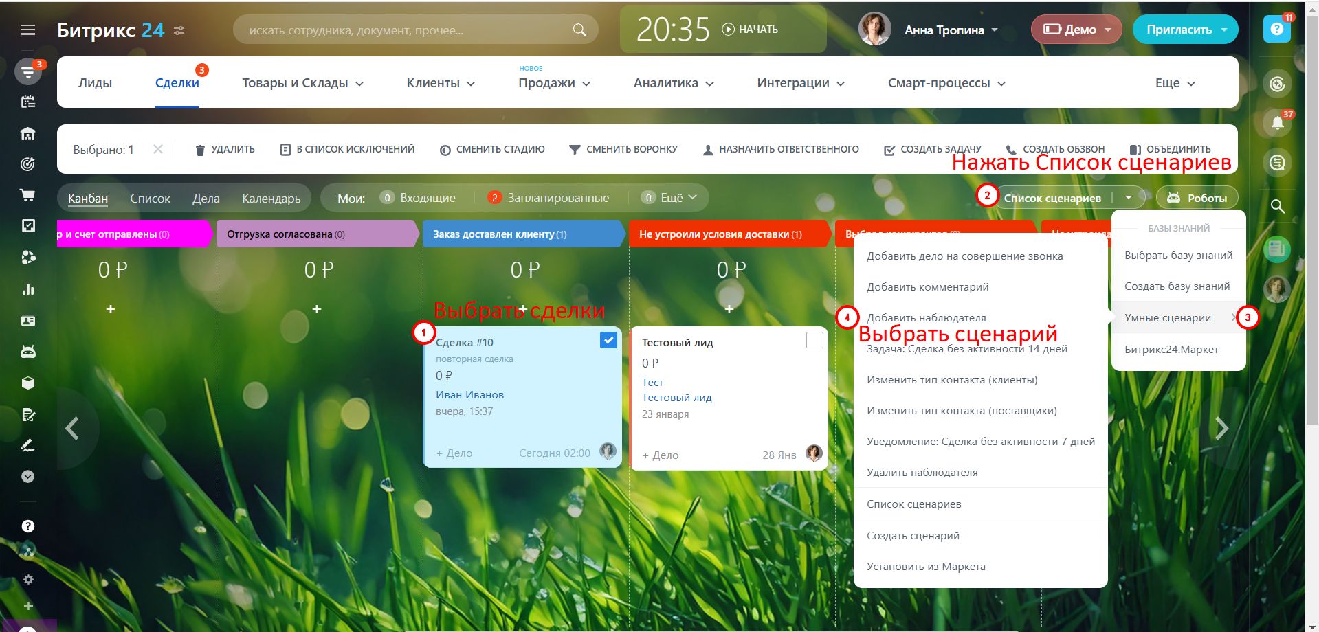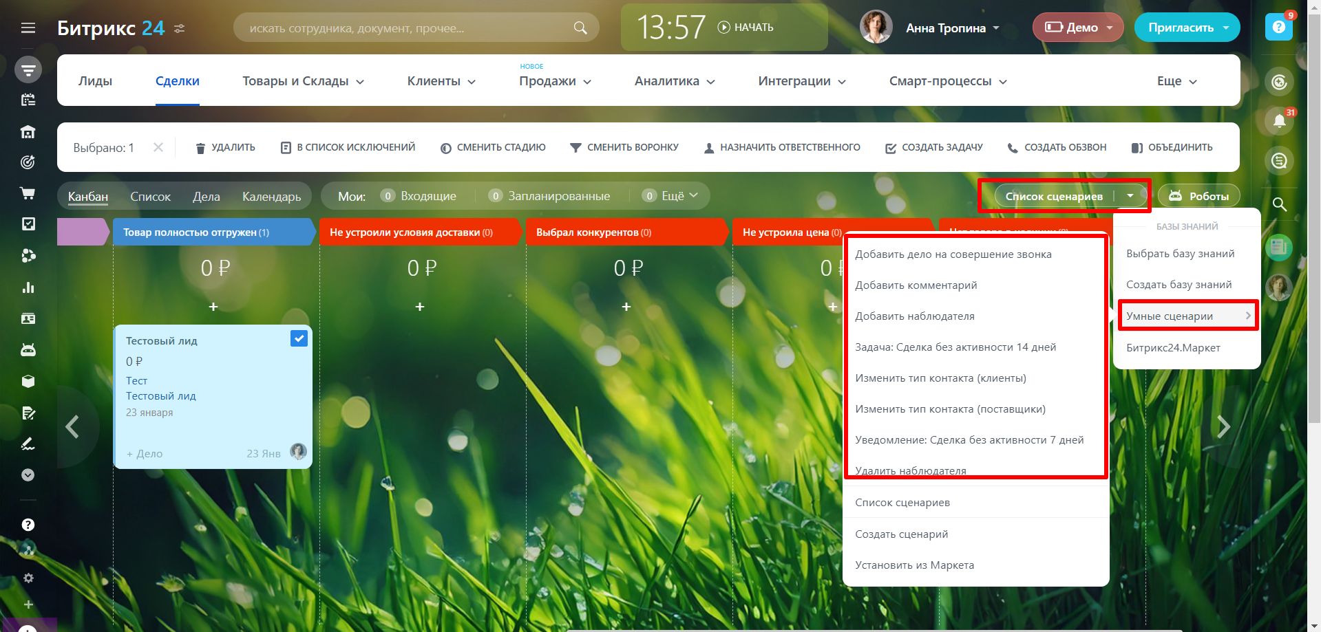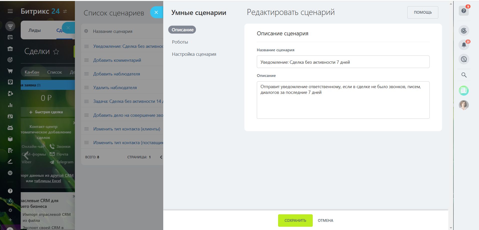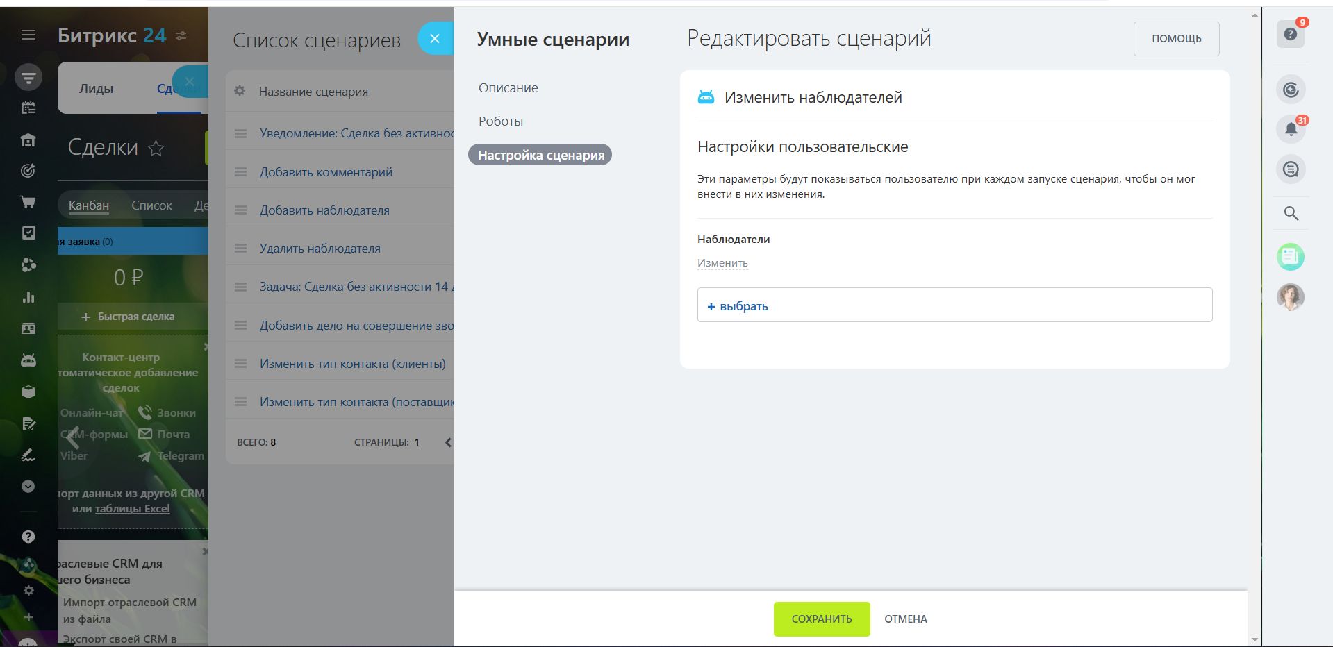 Умные сценарии помогут РОПу быстро выполнять действия со сделками, отслеживать сделки без активности, добавлять или удалять наблюдателей, ставить задачи в сделках без активности