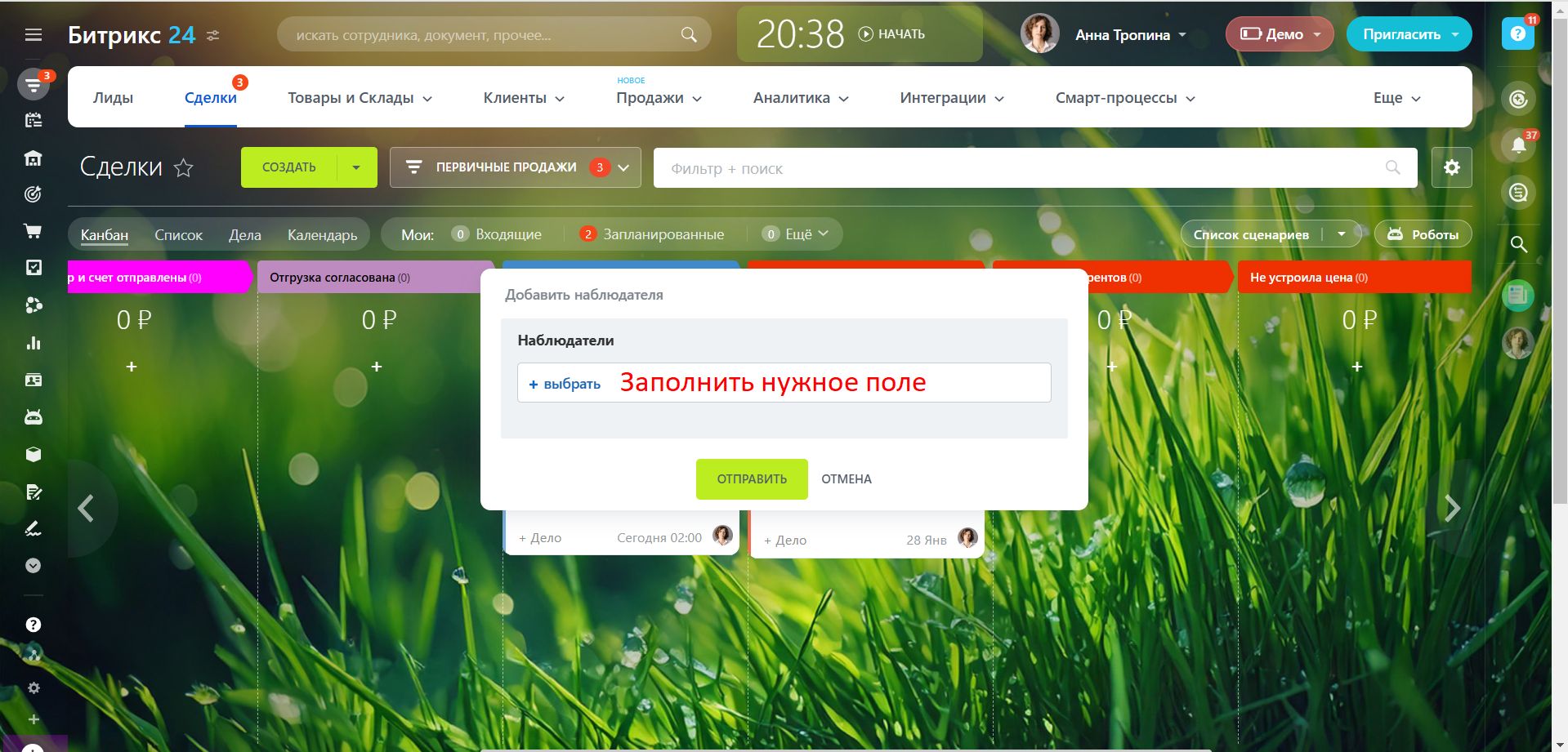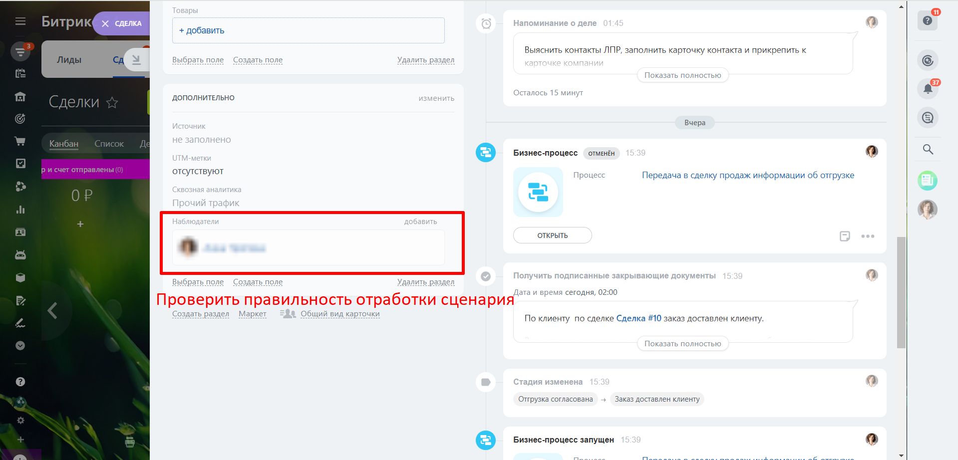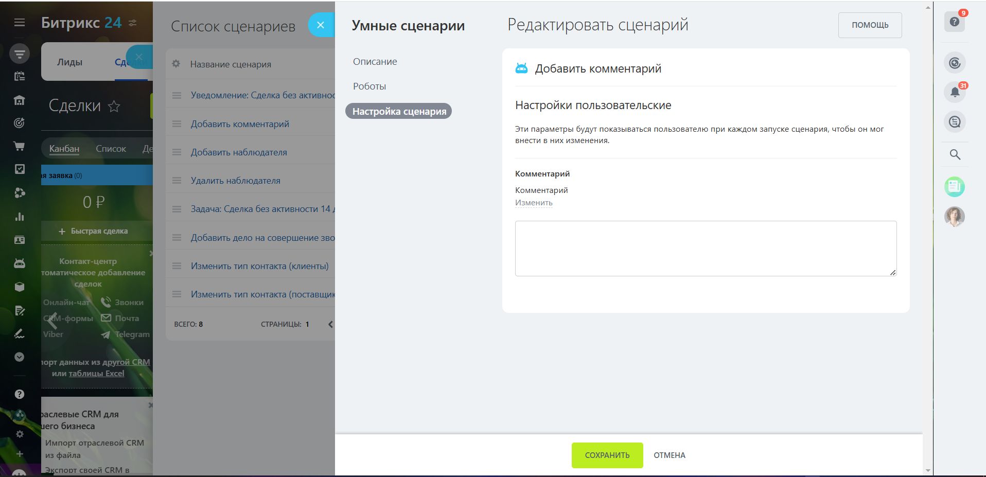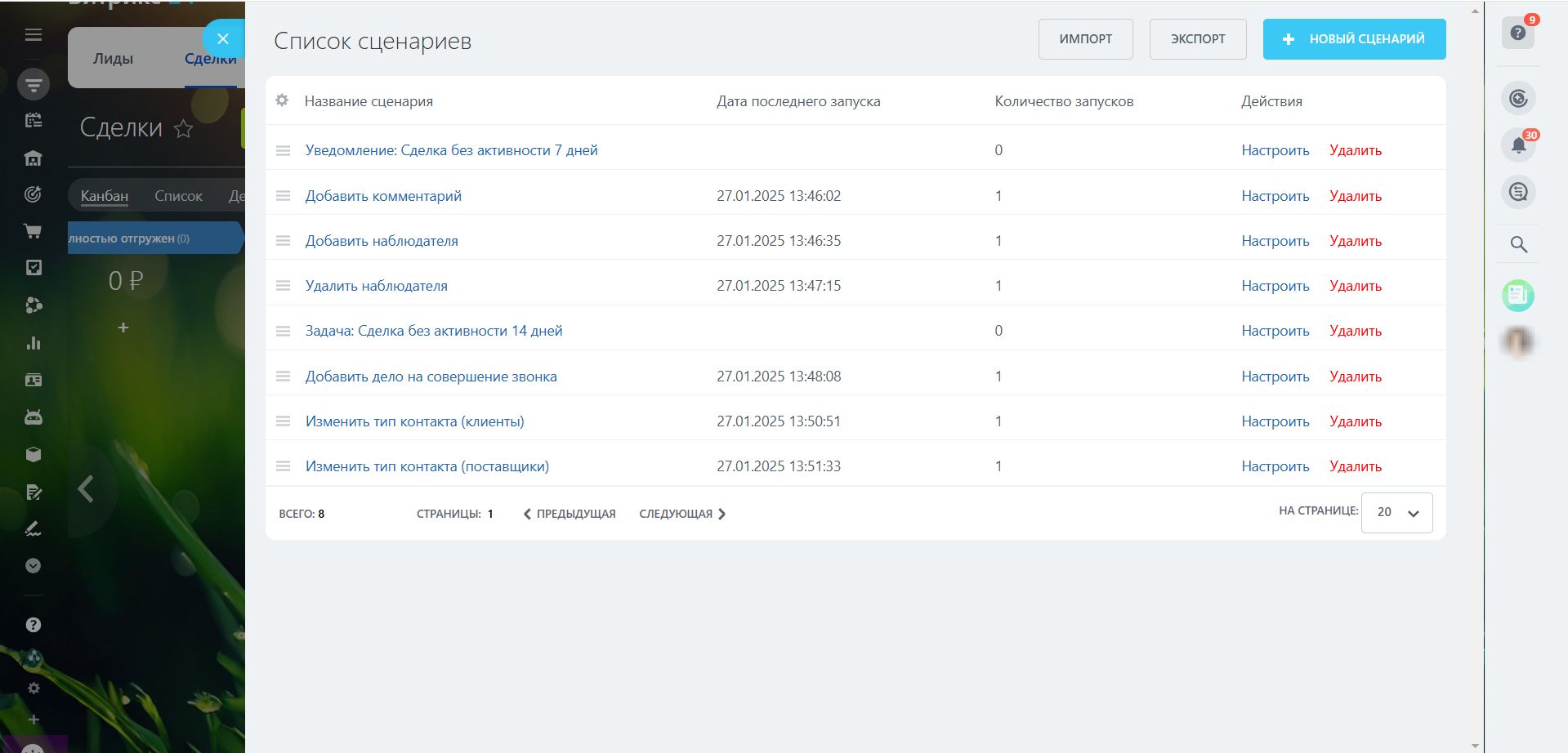 Умные сценарии помогут РОПу быстро выполнять действия со сделками, отслеживать сделки без активности, добавлять или удалять наблюдателей, ставить задачи в сделках без активности