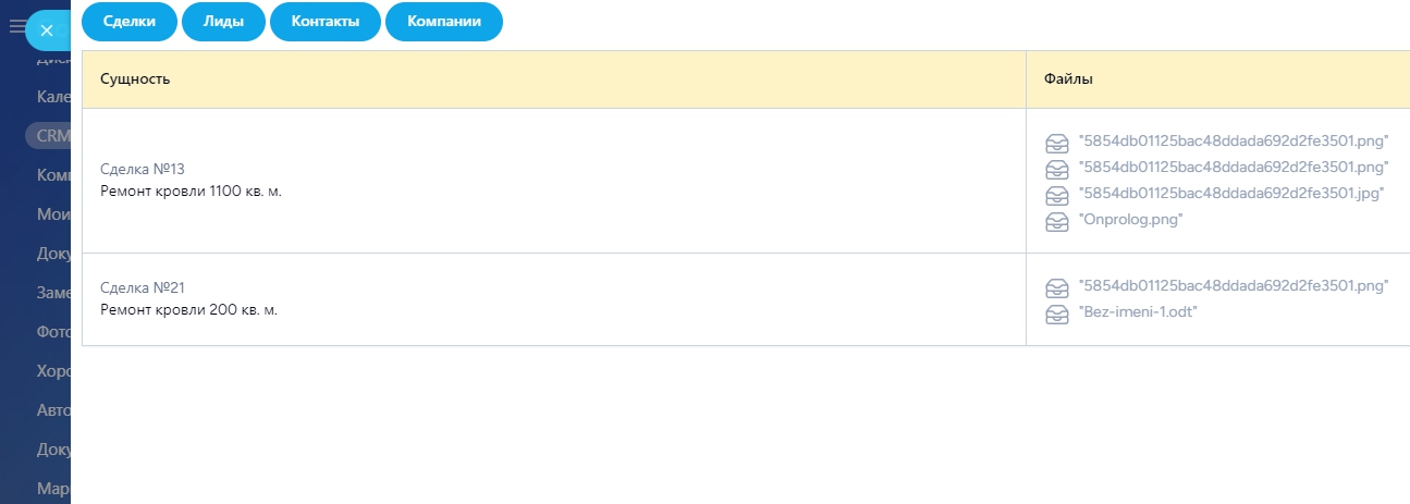 Если у вас есть пользовательские поля типа "файл" в объектах CRM (cделки, лиды, контакты, компании) и вам хочется их увидеть сразу, не проваливаясь в сущность CRM, то тогда наше приложение именно для вас. Вы можете быстро посмотреть по всем объектам новые файлы или скачать нужный документ.