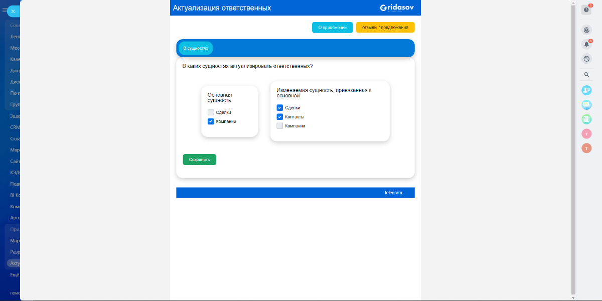 Приложение предназначено для автоматического изменения ответственных в прикрепленных сущностях при изменении ответственного в основной сущности. Она позволяет выбрать основную сущность, где происходит изменение ответственного, а также изменяемые сущности, в которых будет меняться ответственный.