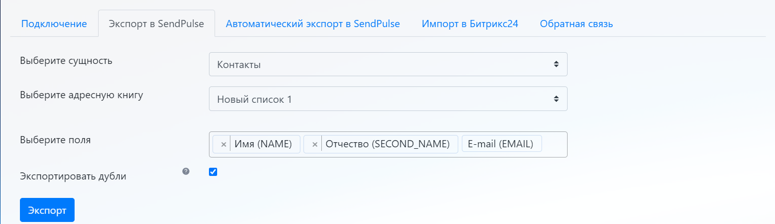 - Экспорт контактов или компаний из Битрикс24 в адресные книги SendPulse. Во время экспорта в SendPulse передаются новые записи и обновляются существующие. На вкладке экспорта можно выбрать экспортируемые поля в SendPulse, если выбранных полей не существует в SendPulse, то они создадутся автоматически. Также на вкладке экспорта имеется возможность отключить экспортирование записей, у которых имеются дубли по e-mail в Битрикс24.