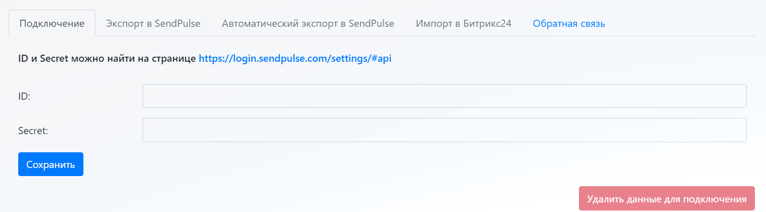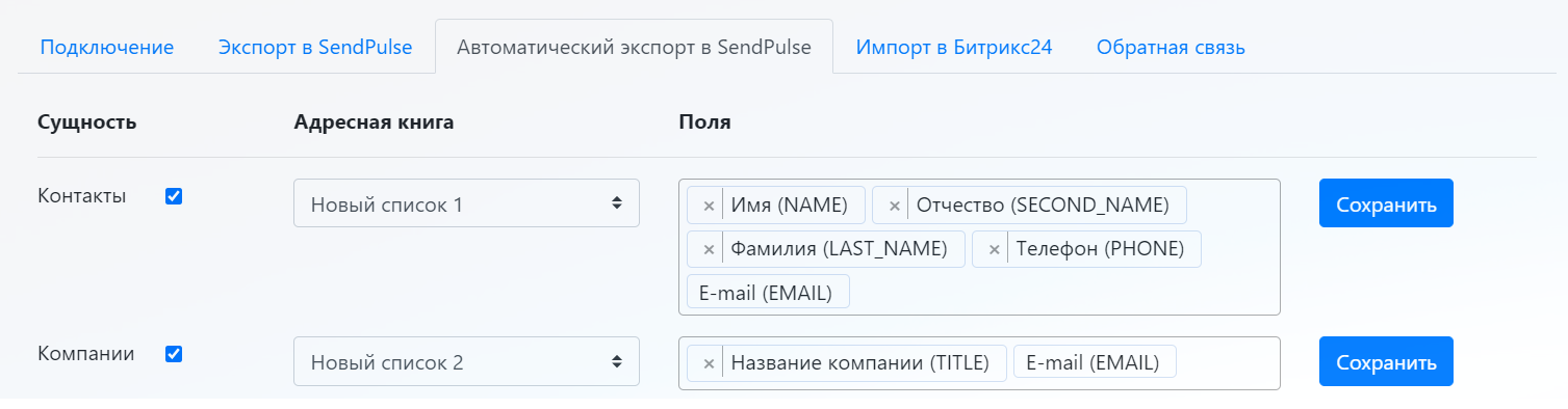 Приложение предоставляет возможность экспорта контактов и компаний с выбором некоторых полей из Битрикс24 в адресные книги SendPulse, а также импорт записей с выбором некоторых полей из адресных книг SendPulse в контакты Битрикс24.