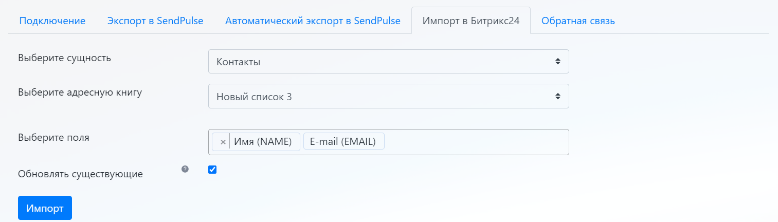 - Импорт записей из адресных книг SendPulse в контакты Битрикс24. Во время импорта в Битрикс24 передаются новые записи и обновляются существующие. На вкладке импорта можно выбрать импортируемые поля в Битрикс24 (имя, телефон), если имя у записи в SendPulse не заполнено, то в Битрикс24 оно будет иметь значение "Пустое имя". Если у записи в Битрикс24 имеется телефон и импортируется запись с таким же e-mail, но другим номером телефона, то номер телефона добавится к существующим и не удалит старый.