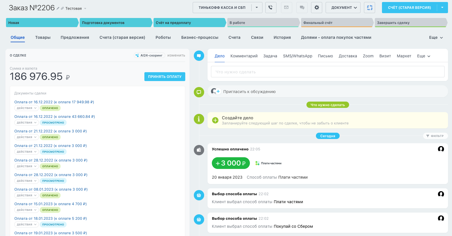 - Всегда актуальное состояние платежа в Timeline сделки или заказа.