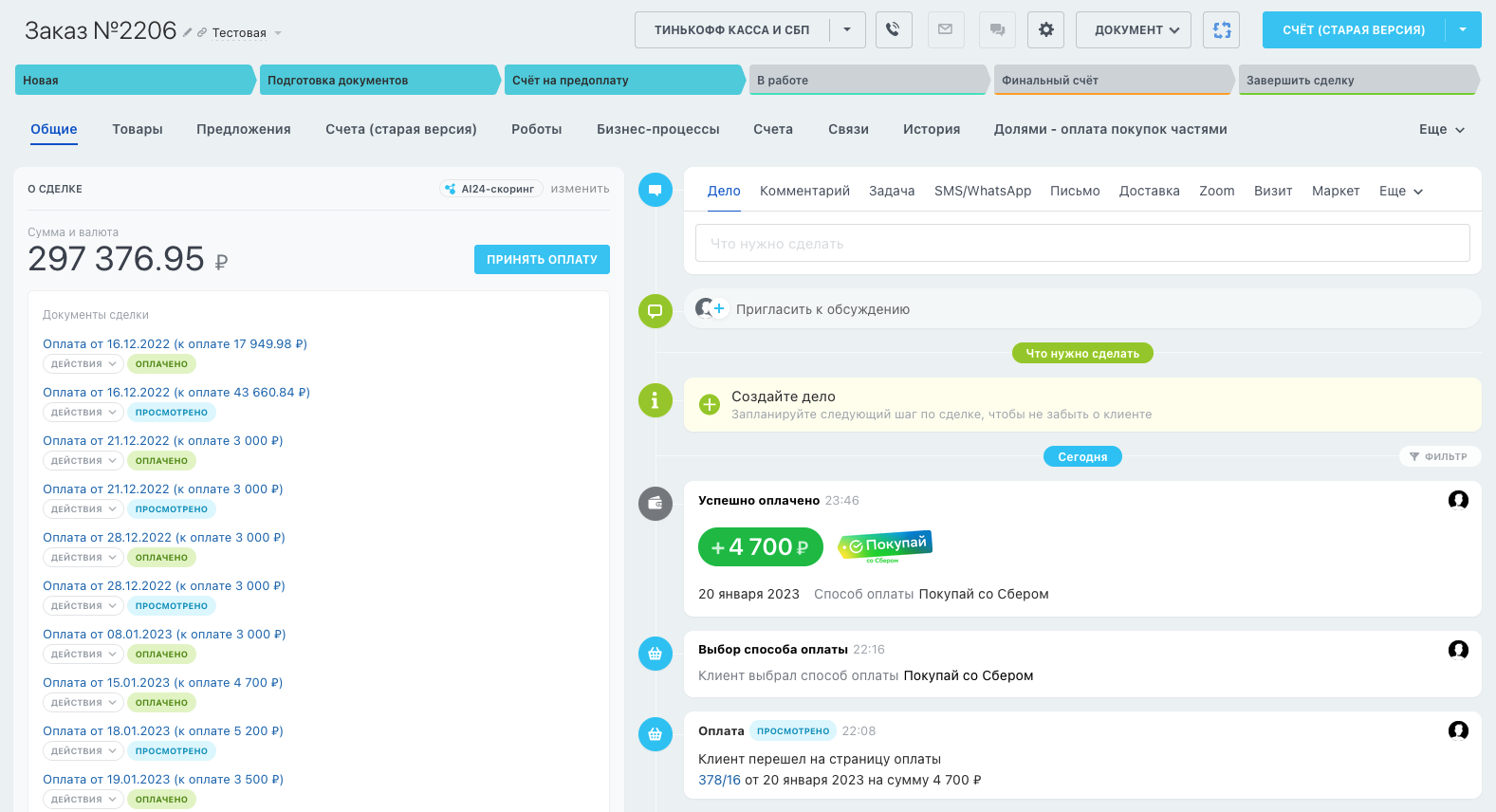 - Всегда актуальное состояние платежа в Timeline сделки или заказа.