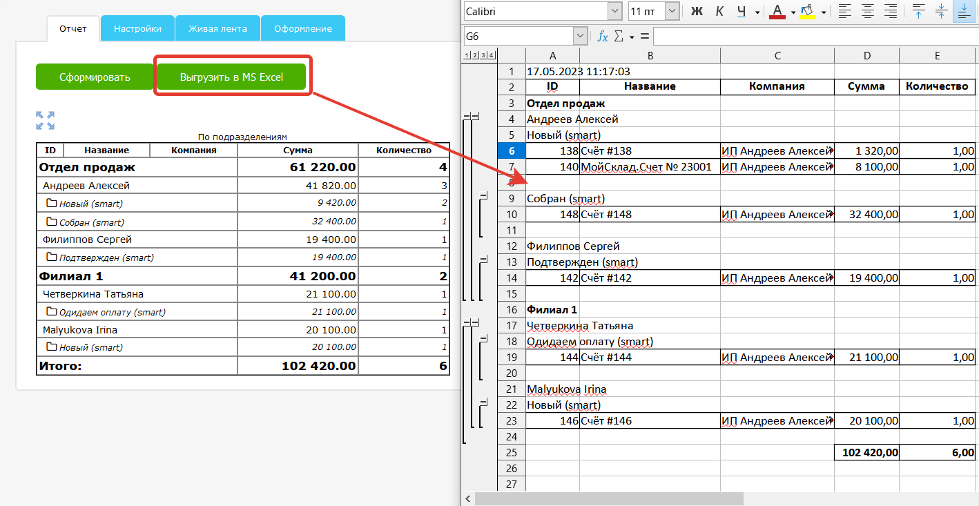 - Выгрузка в MS Excel. Приложение формирует файл, полностью совместимый с MS Excel, включая группировку данных.