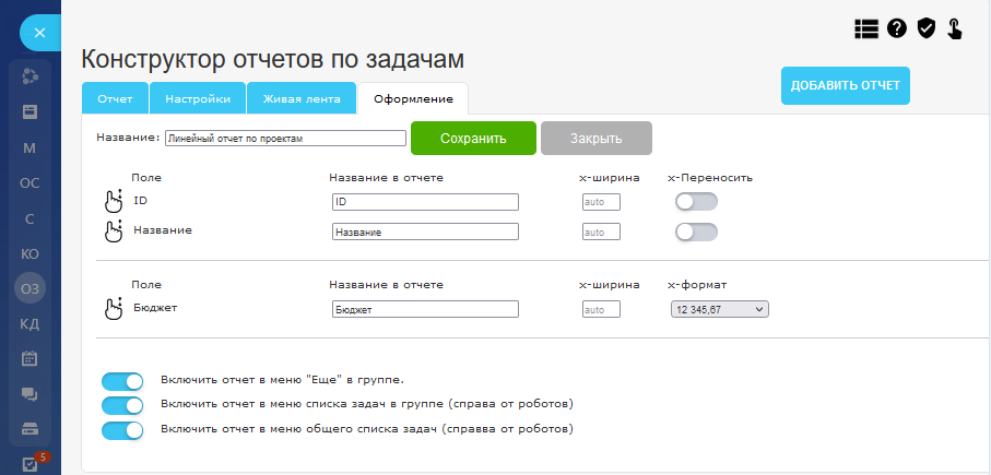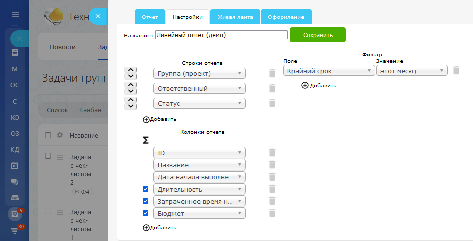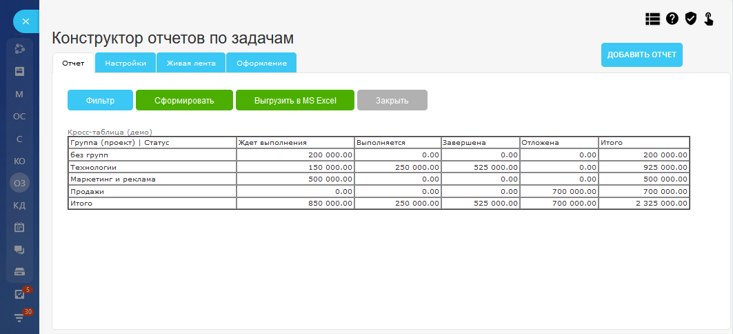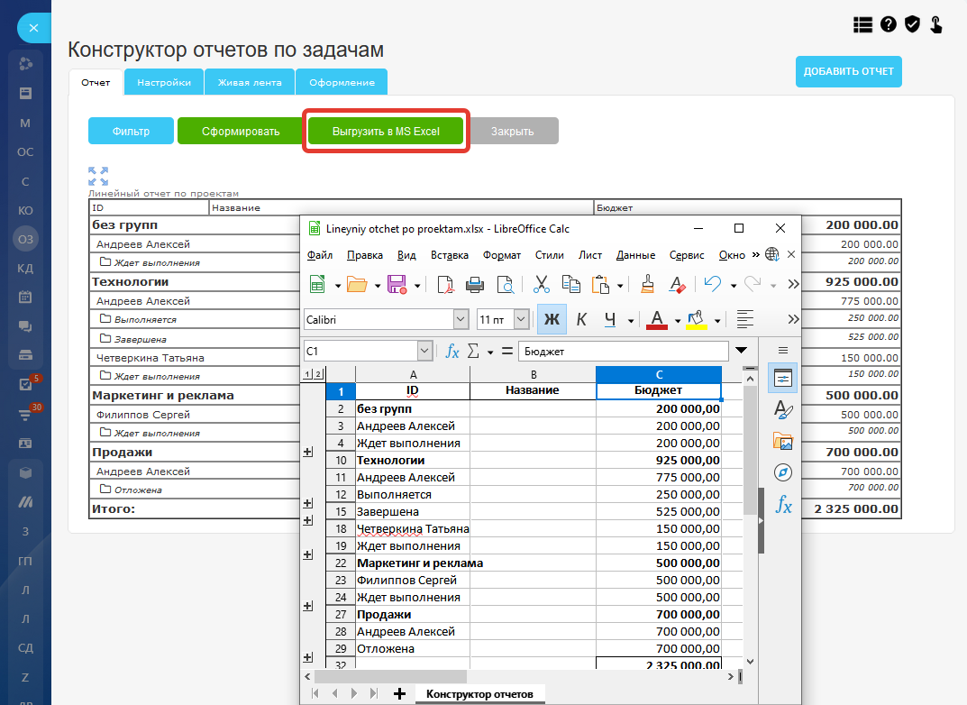 Универсальный конструктор отчетов по задачам. Выгрузка отчета в MS Excel.