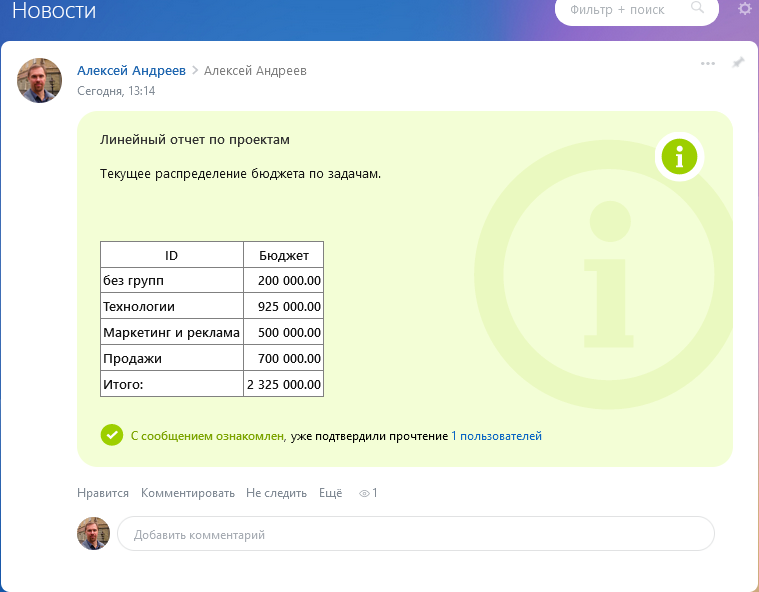 Дополнительные плюсы и возможности:- Публикация в живую ленту. Удобная коммуникация с коллегами, возможность совместно работать над данными отчета и предлагать новые сценарии развития. Отчет может быть опубликован непосредственно в сообщении и прикреплен файлом.