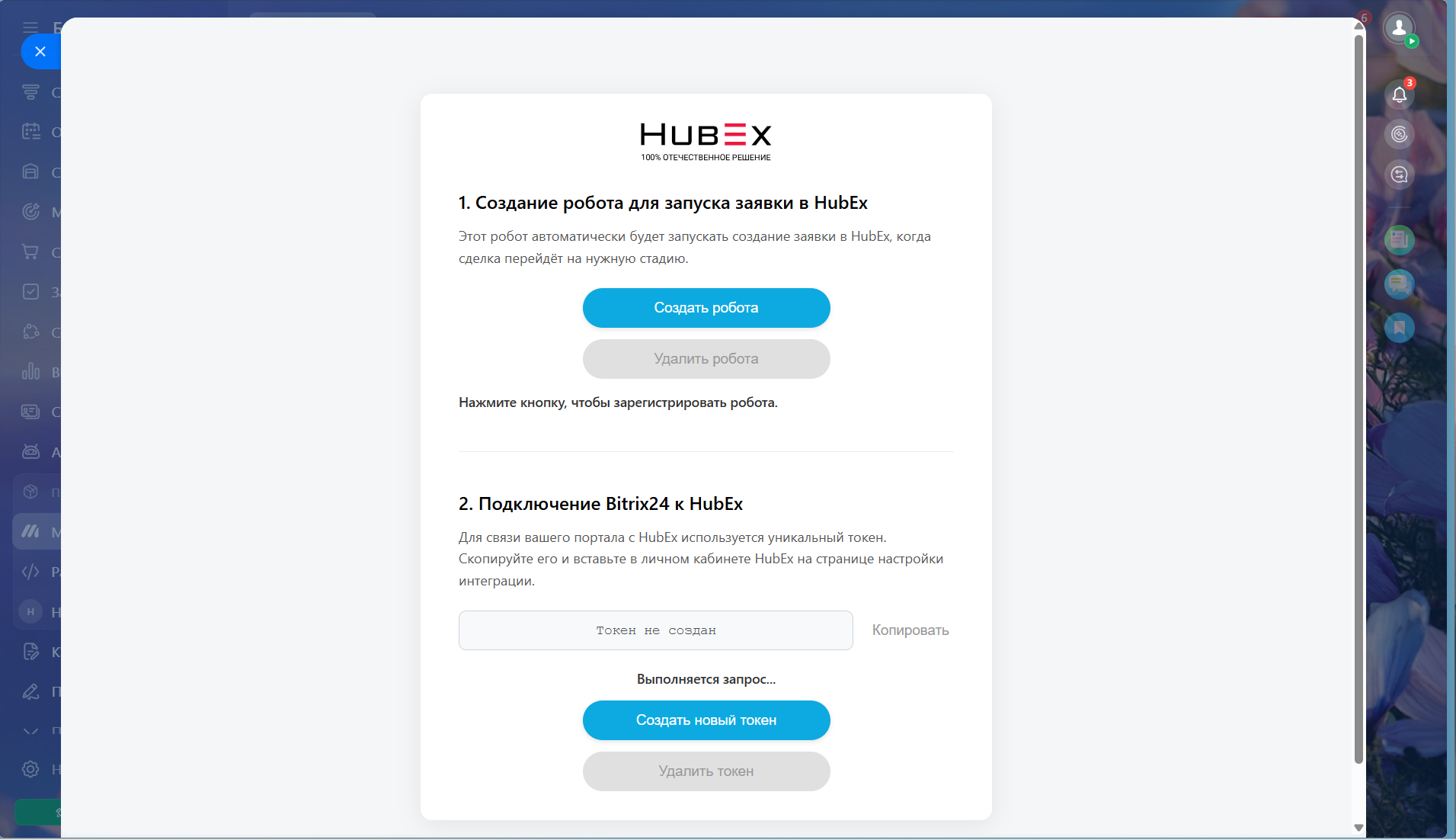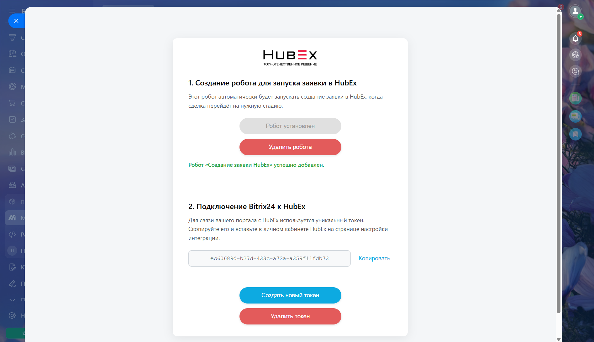 • При достижении определённой стадии сделки в Битрикс24 автоматически создаётся заявка на сервисное обслуживание в HubEx.