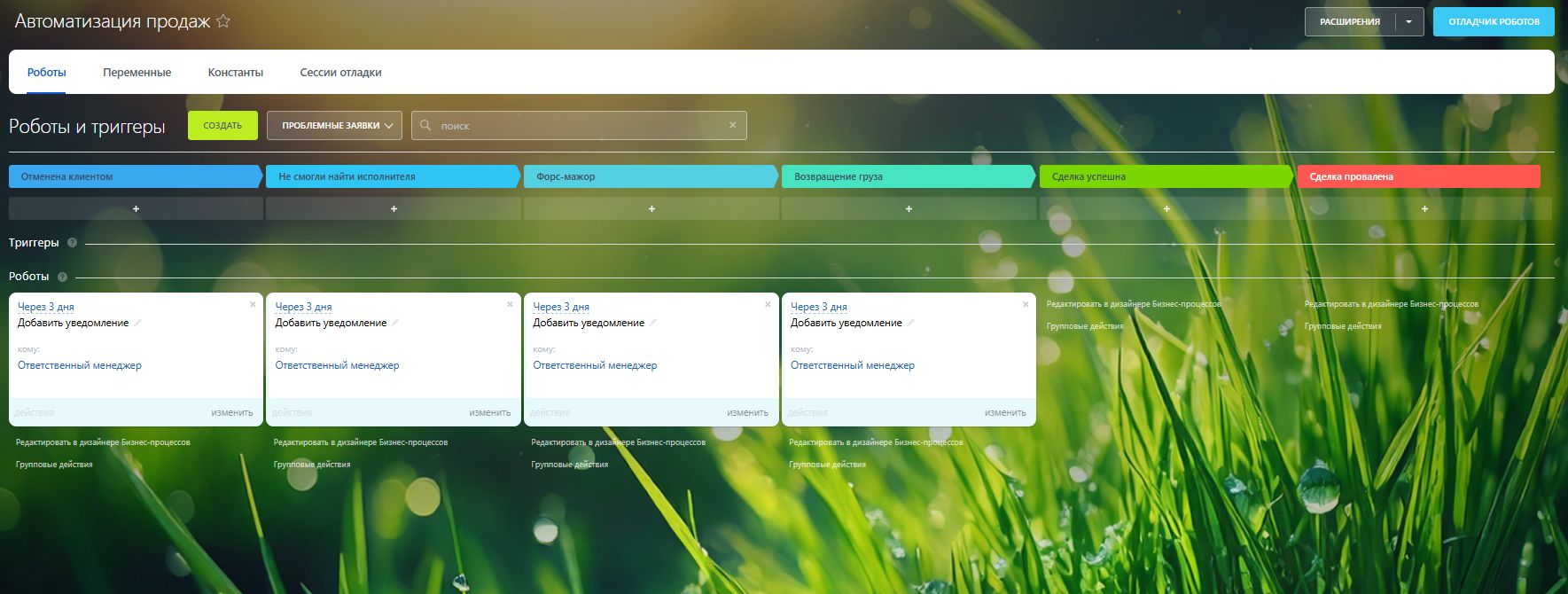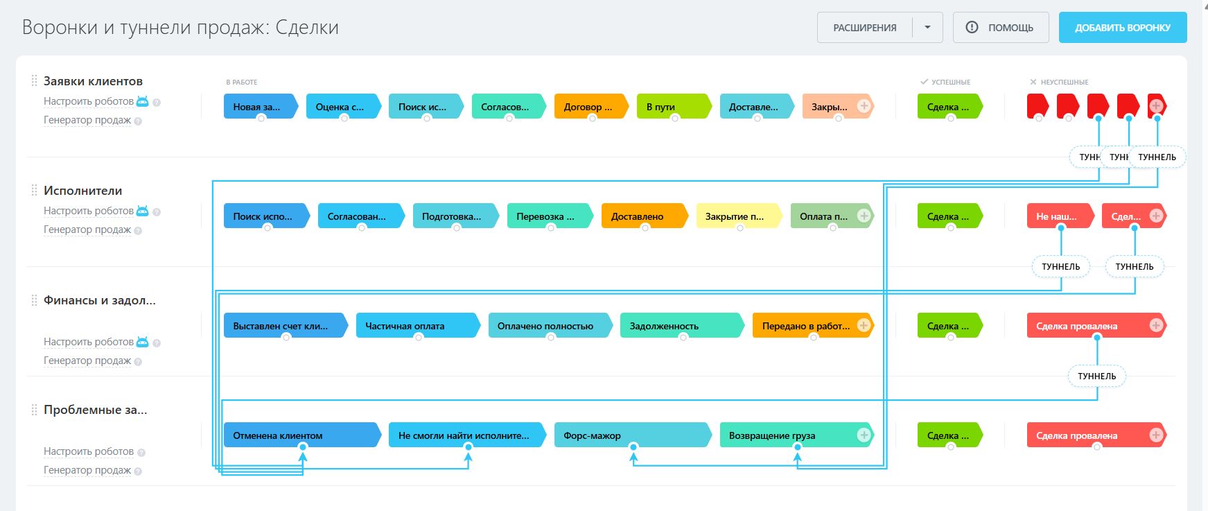 Готовый комплект автоматизированных воронок для логистических компаний, позволяющий быстро организовать и упростить управление перевозками, финансами и подрядчиками.
