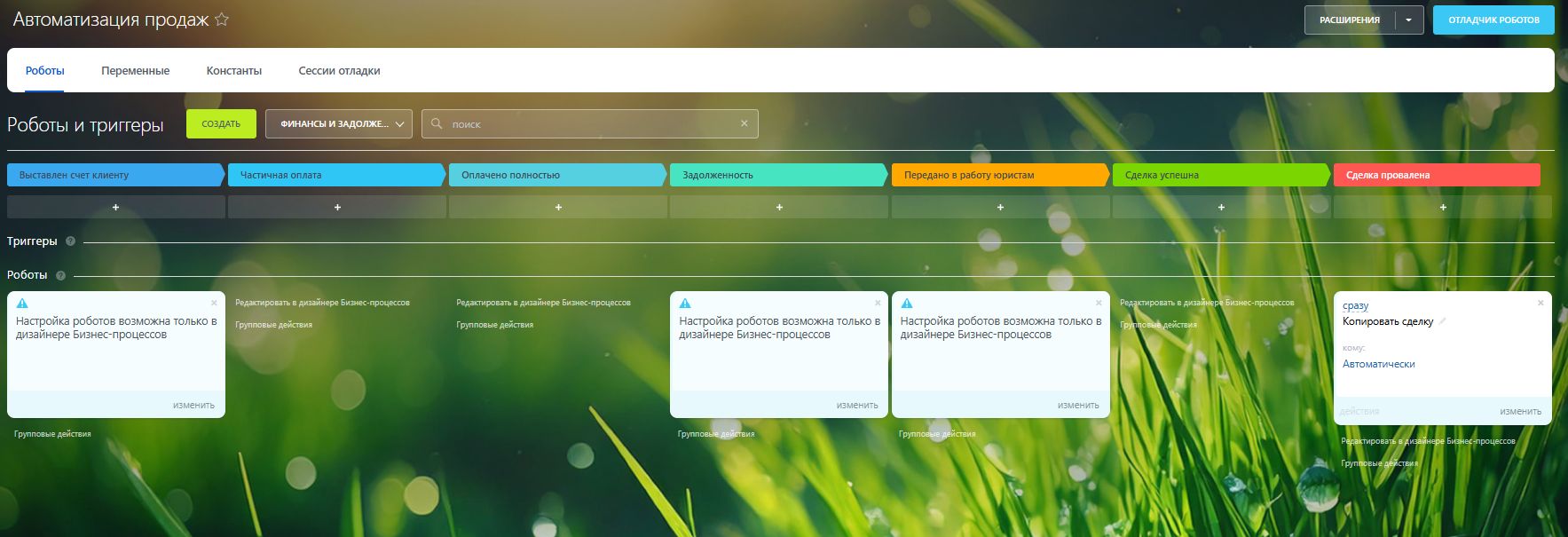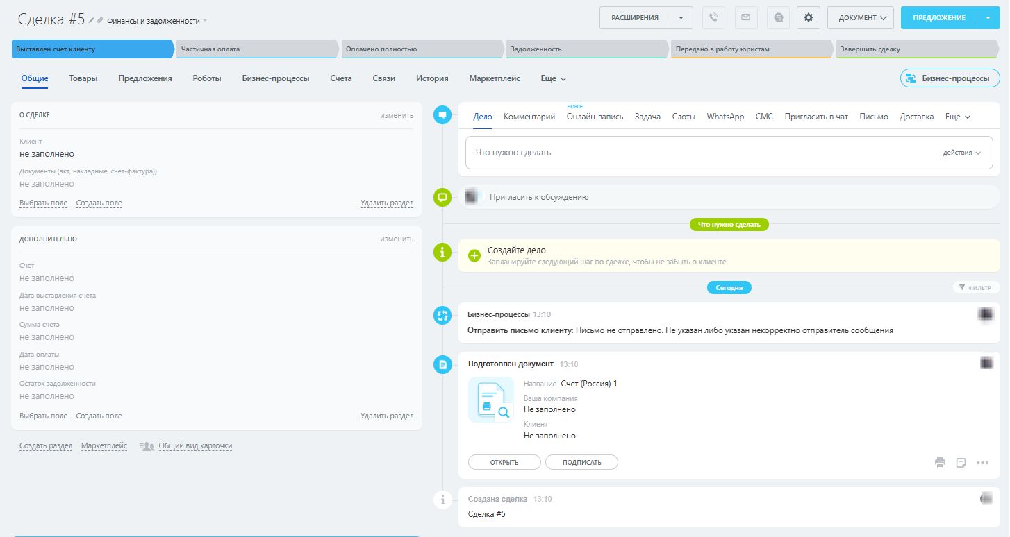 3. Воронка «Финансы и задолженности» Полностью автоматизирован процесс выставления счетов, контроль оплат и своевременное напоминание клиентам о задолженностях. Проблемные платежи автоматически передаются в работу юристам.