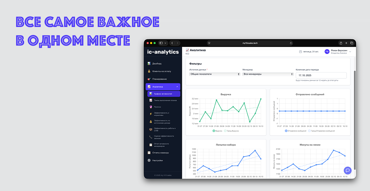 ic-analytics — это облачное приложение, которое автоматически собирает данные из вашей CRM Bitrix24, анализирует их с помощью искусственного интеллекта и предоставляет детальную аналитику в удобных дашбордах. Решение помогает руководителям и собственникам видеть реальную картину продаж и повышать эффективность команды.