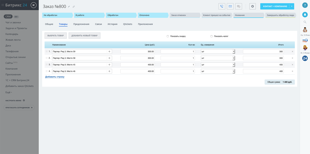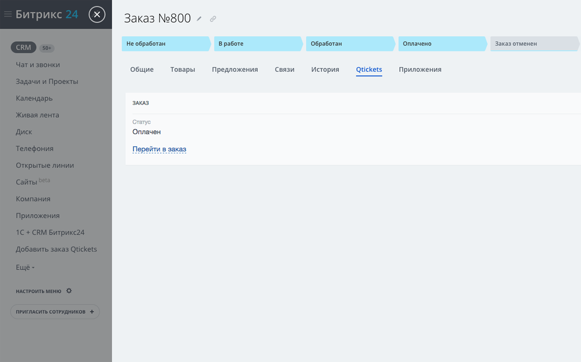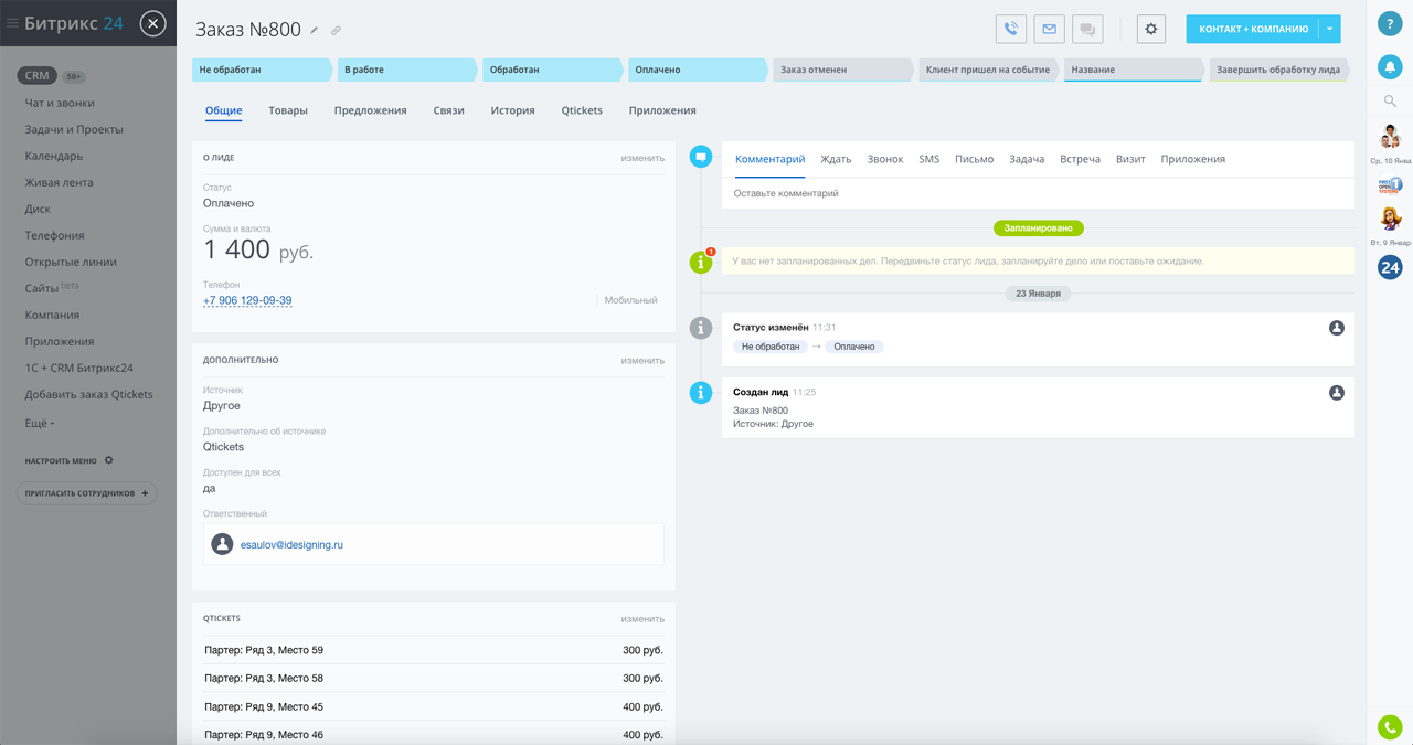 Сервис продажи билетов и регистрации участников на мероприятия Qtickets.ru позволит передавать в Битрикс24 данные о покупателях и лидах, а так же моментально выводить деньги с продаж.