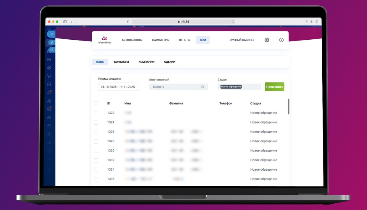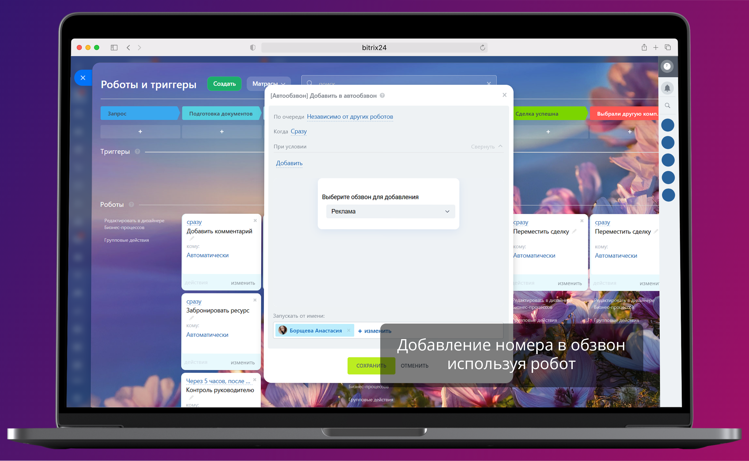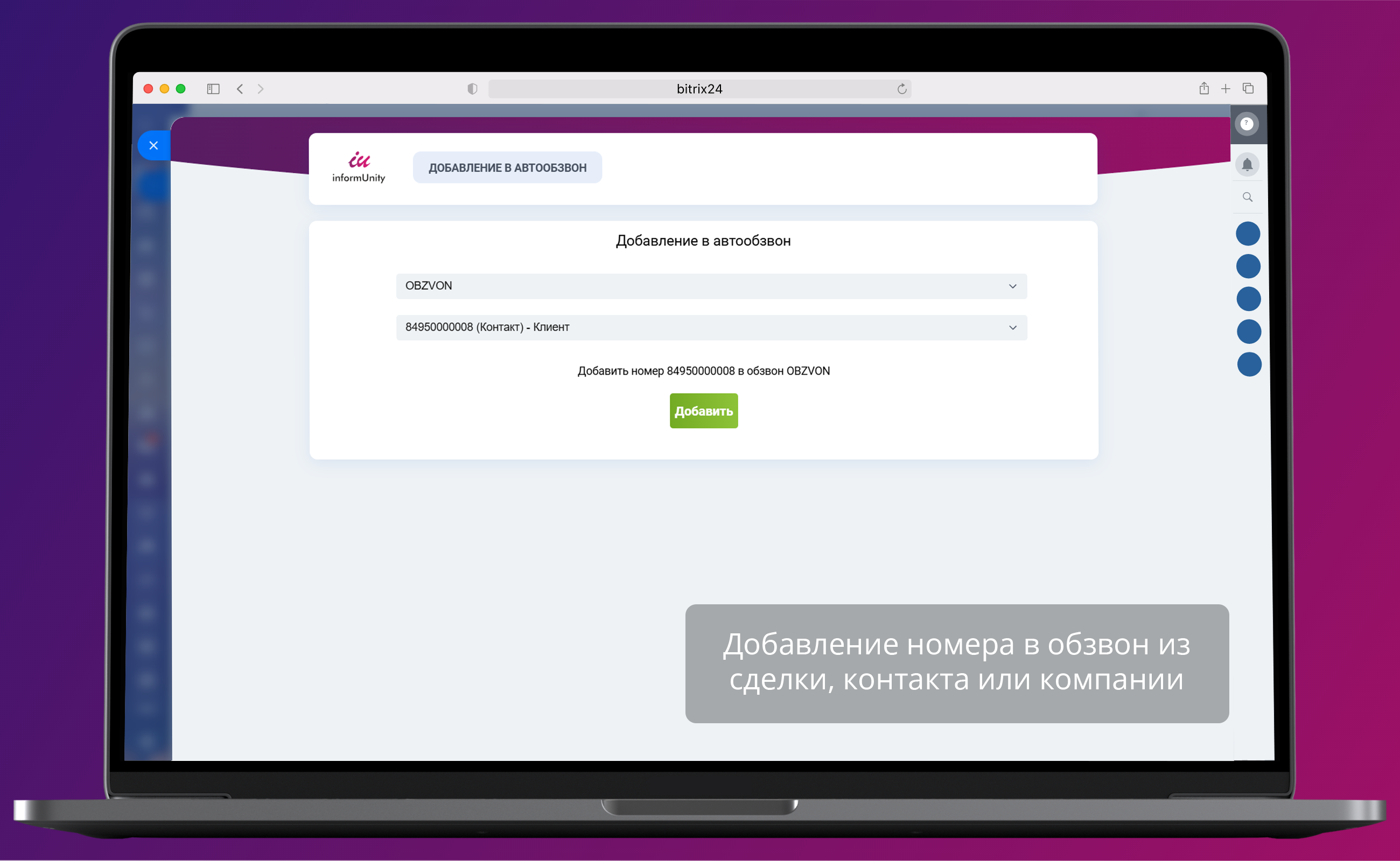 Интеграция с CRM: добавляйте номера в обзвон прямо из карточек контактов, компаний, лидов или сделок. Также доступна автоматическая отправка номеров в обзвон с помощью роботов, умных сценариев и бизнес-процессов Битрикс24.