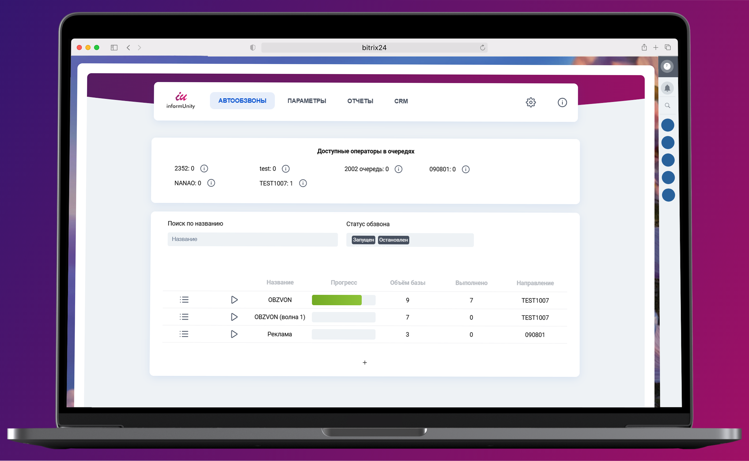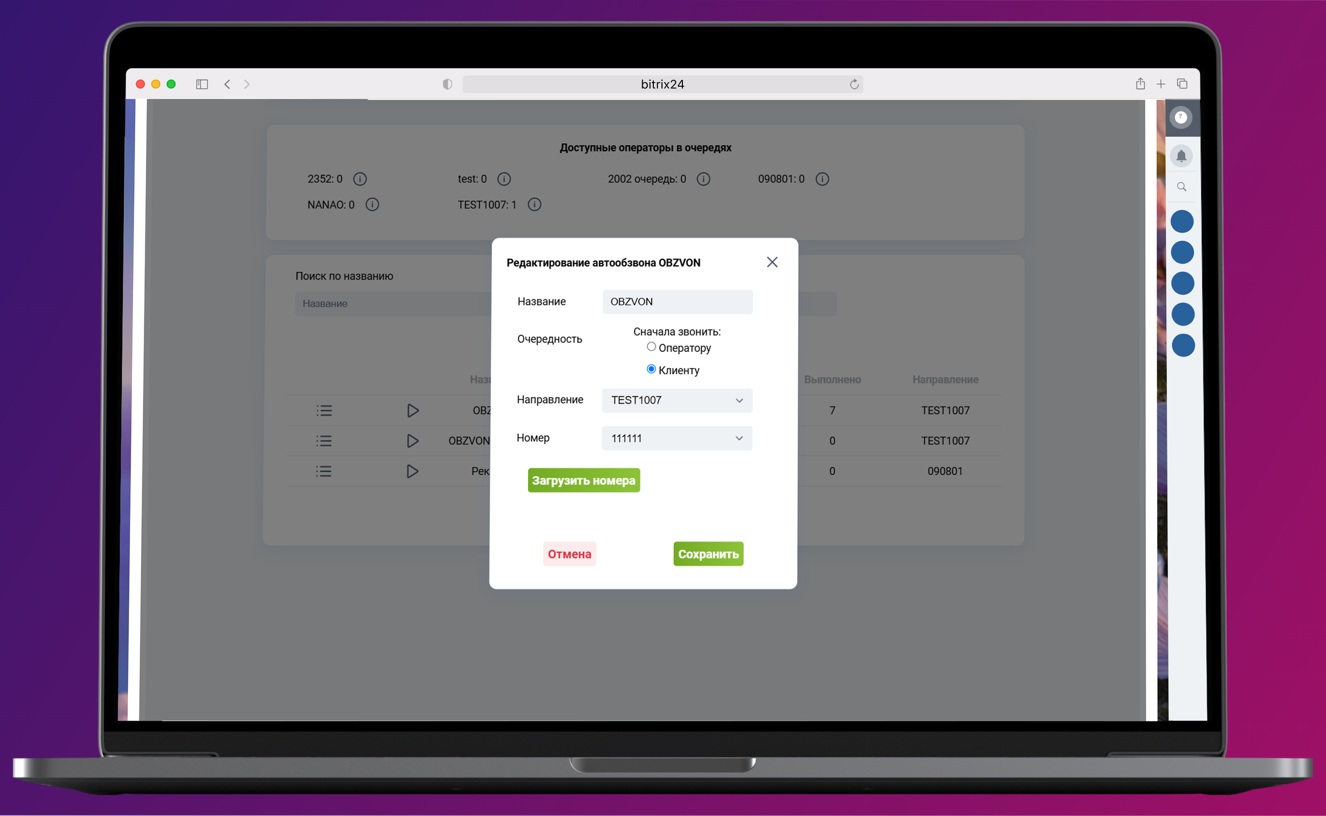 Приложение «Автообзвон» для Битрикс24 автоматизирует исходящие звонки по базе CRM или из загруженного csv файла, снижает нагрузку на сотрудников и повышает эффективность отдела продаж. С его помощью вы можете запустить массовый автообзвон клиентов прямо из CRM, выбрать очередь операторов, задать порядок обзвона (сначала клиенту или сначала оператору), использовать голосовое приветствие и отслеживать результаты в удобных отчетах. Поддерживается добавление номеров из сделок, лидов, контактов, компаний, а также автоматическое добавление номера в обзвон через роботов, умных сценариев или бизнес-процессов.