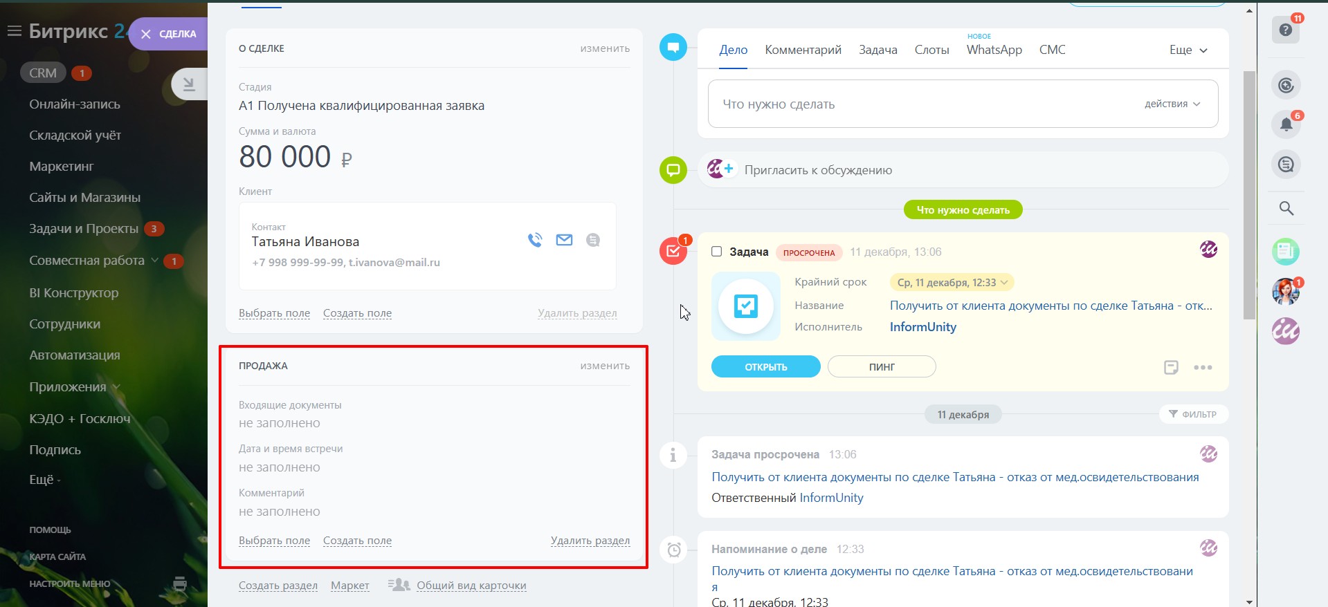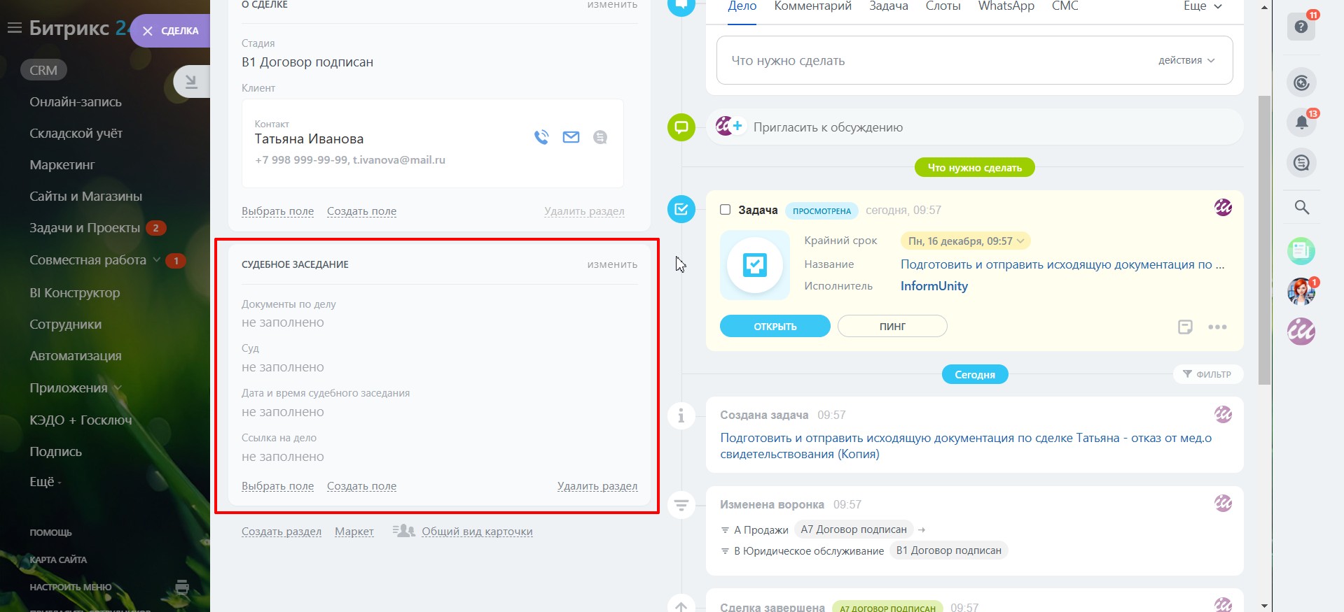 - Вся информация хранится в одном месте: карточки CRM содержат все необходимые поля для обогащения сделок по делам ваших клиентов важной информацией (например: документы по делу, название суда, решение суда и т.д.). При необходимости вы можете добавить собственные поля в карточку сделки/дела.
