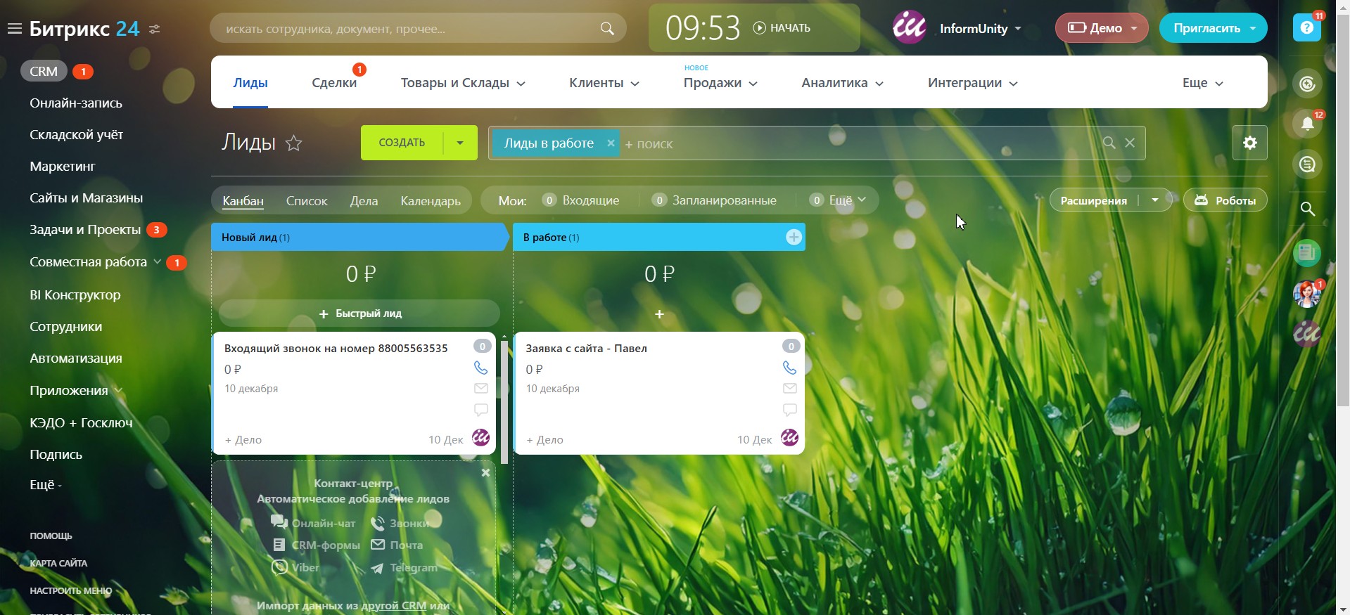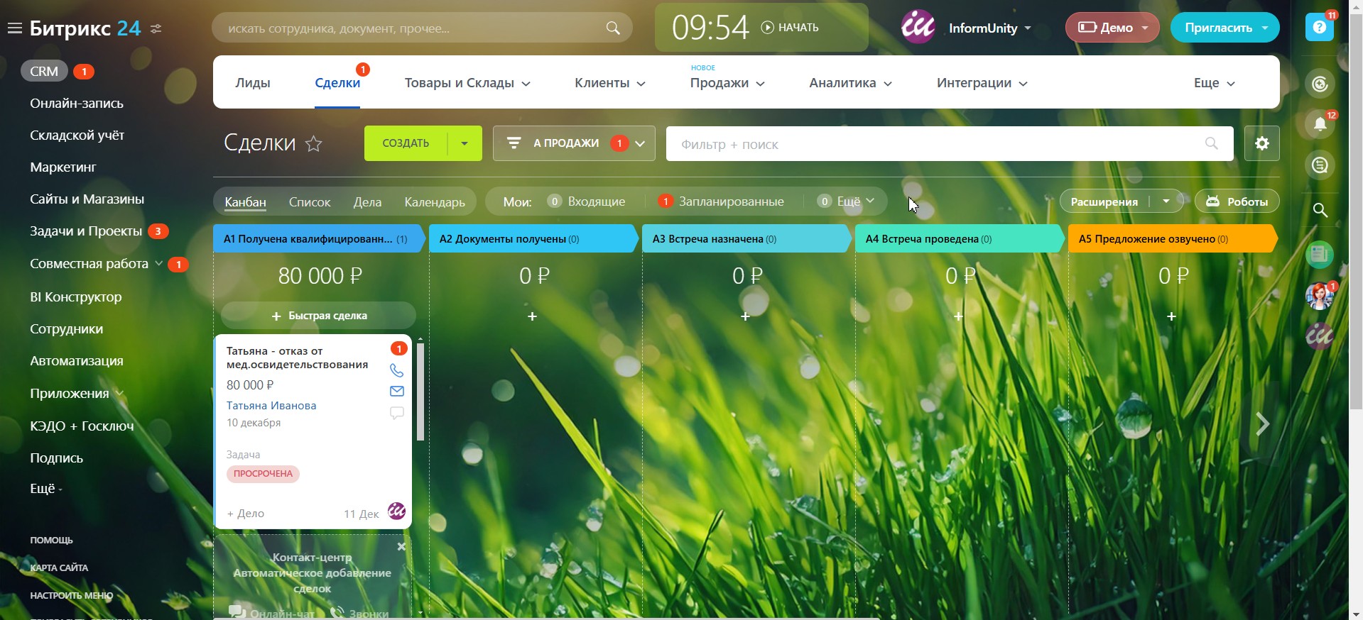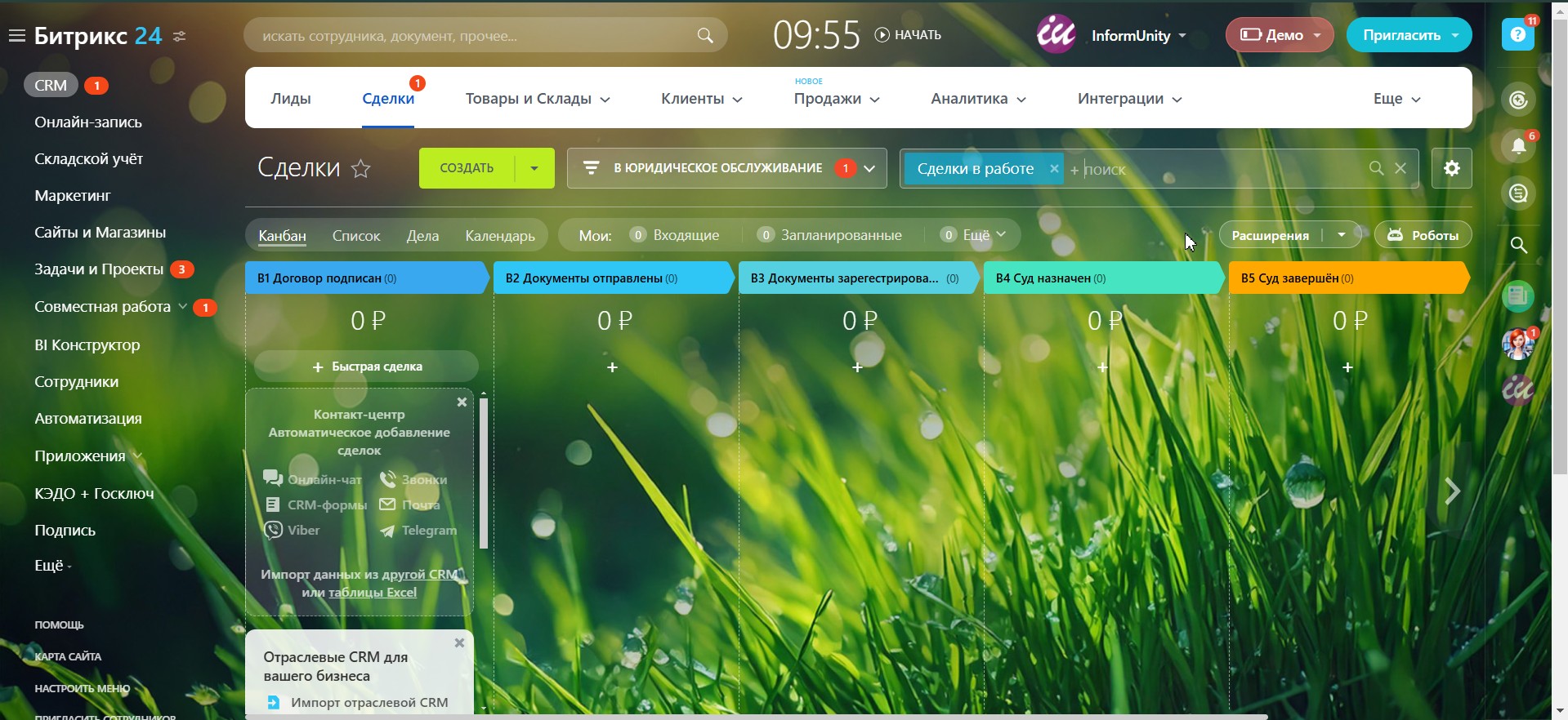 - Стандартный - доступны Лиды, доступны воронки в сделках: А Продажи, B Юридическое обслуживание. В сделках доступна автоматическая постановка задач, отправка уведомлений сотрудникам, контроль сроков нахождения сделок на стадиях, туннели продаж.