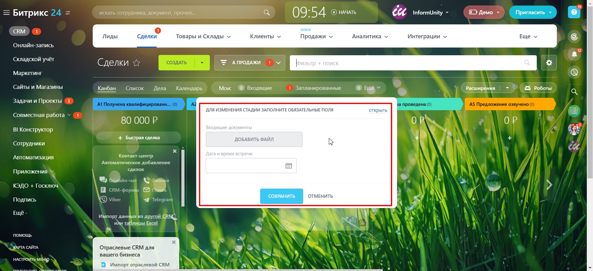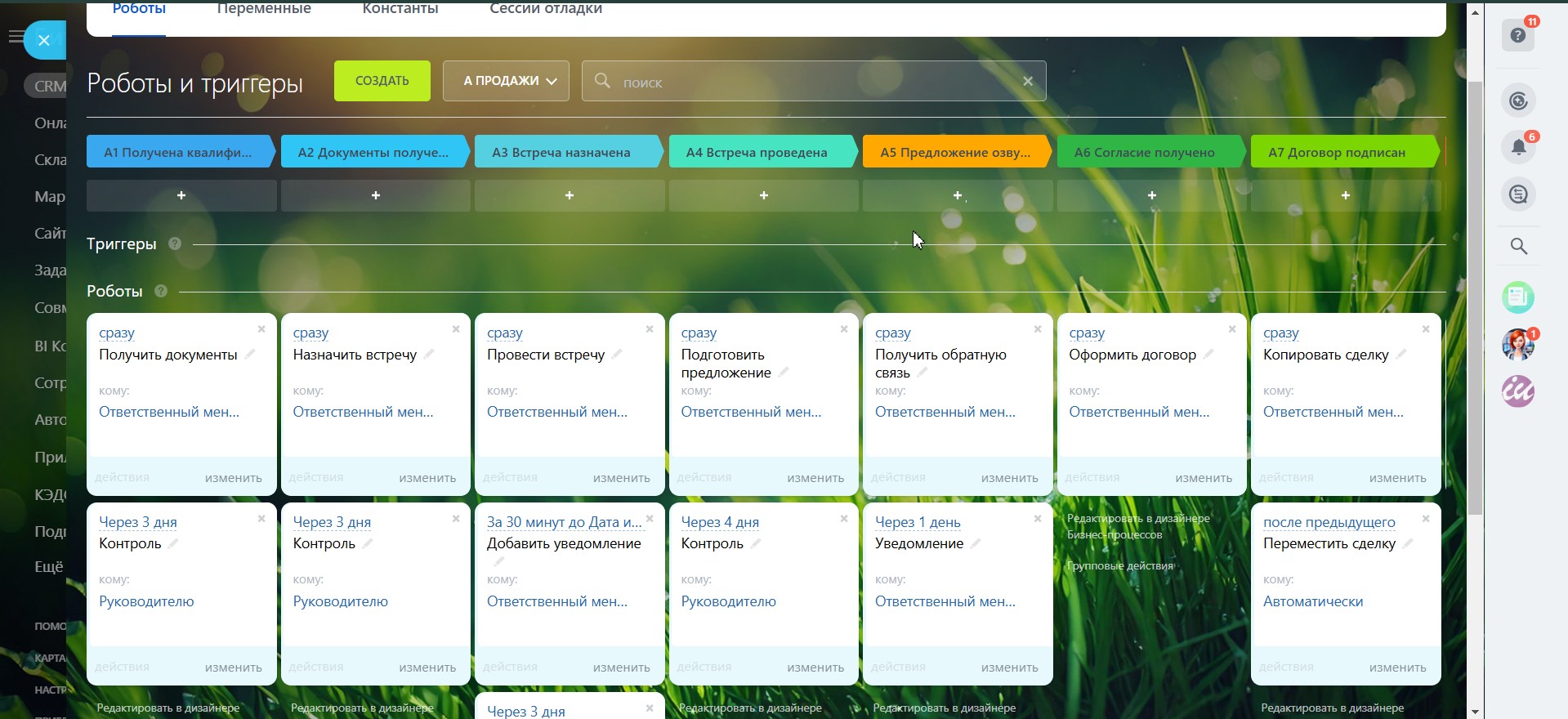 - Каждый этап работы со сделкой/делом сопровождается планированием следующего действия по сделке/делу клиента с помощью автоматической постановки задачи (автозадачи можно легко перенастроить под детали вашего процесса).