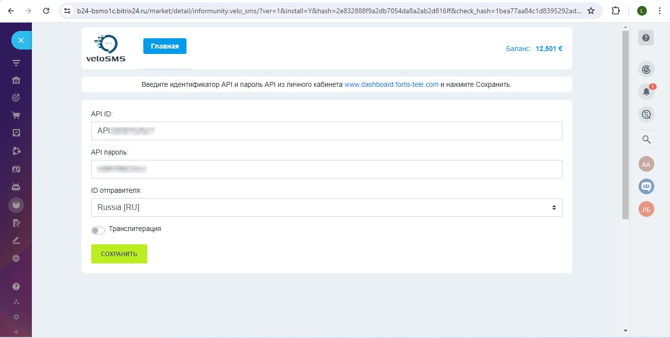 - После успешной регистрации Вы получите письмо с данными для интеграции (API username, API password), которые Вы должны ввести в настройки приложение VeloSMS после установки в Bitrix24.
