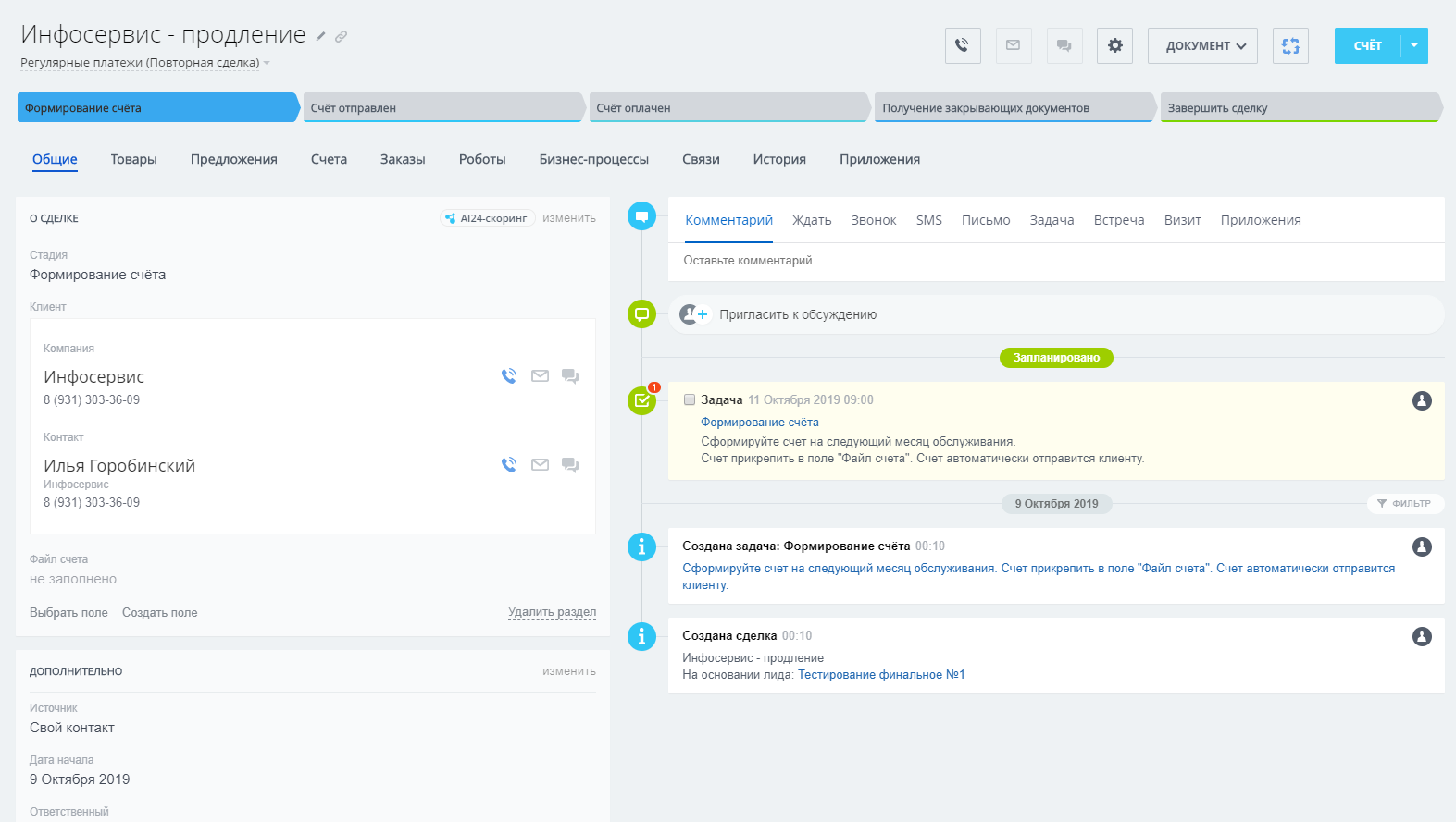 - Воронка «Регулярные платежи»: автоматическая постановка задачи «Формирование счета». Автоматическая отправка счета клиенту на почту, напоминание менеджеру о проверке факта оплаты. Периодические напоминания менеджеру получить закрывающие документы и завершить Сделку. Автоматическое создание Сделки на следующую оплату в зависимости от даты окончания срока обслуживания.