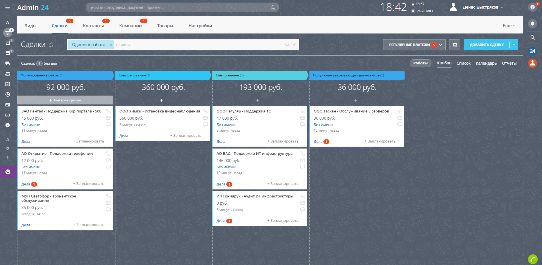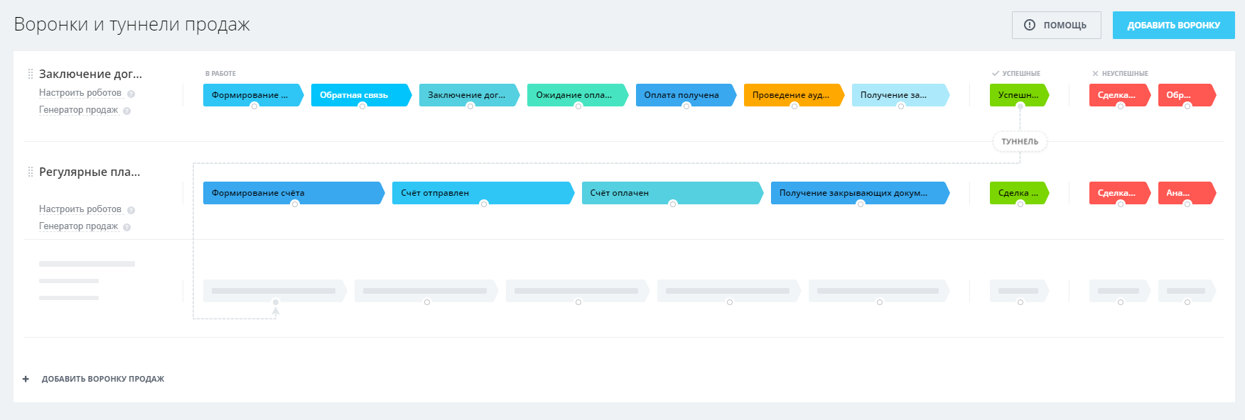 - Воронка «Регулярные платежи»: автоматическая отправка счета клиенту на почту, напоминание менеджеру о проверке факта оплаты.