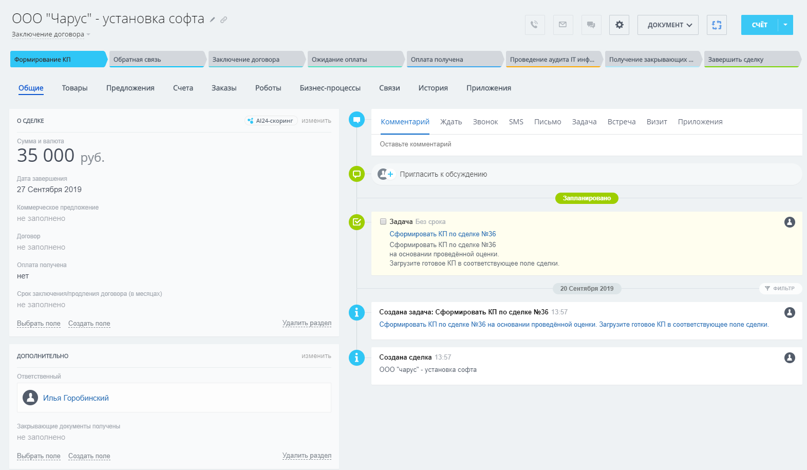 - Воронка «Заключение договора»: автоматическая постановка задачи «Сформировать КП». После завершения задачи происходит смена стадии и напоминания менеджеру получить обратную связь. Автоматическая постановка задачи «Составить договор». После завершения задачи менеджеру приходит уведомление с инструкцией для дальнейших действий. На стадии «Ожидание оплаты» периодически назначаются звонки для уточнения статуса оплаты. Автоматическое уведомление руководителю в случае задержки Сделки на этой стадии. Автоматическая постановка задачи «Провести аудит». После завершения происходит переход на следующую стадию с уведомлением об этом менеджеру. Периодические напоминания менеджеру: получить закрывающие документы и завершить Сделку.