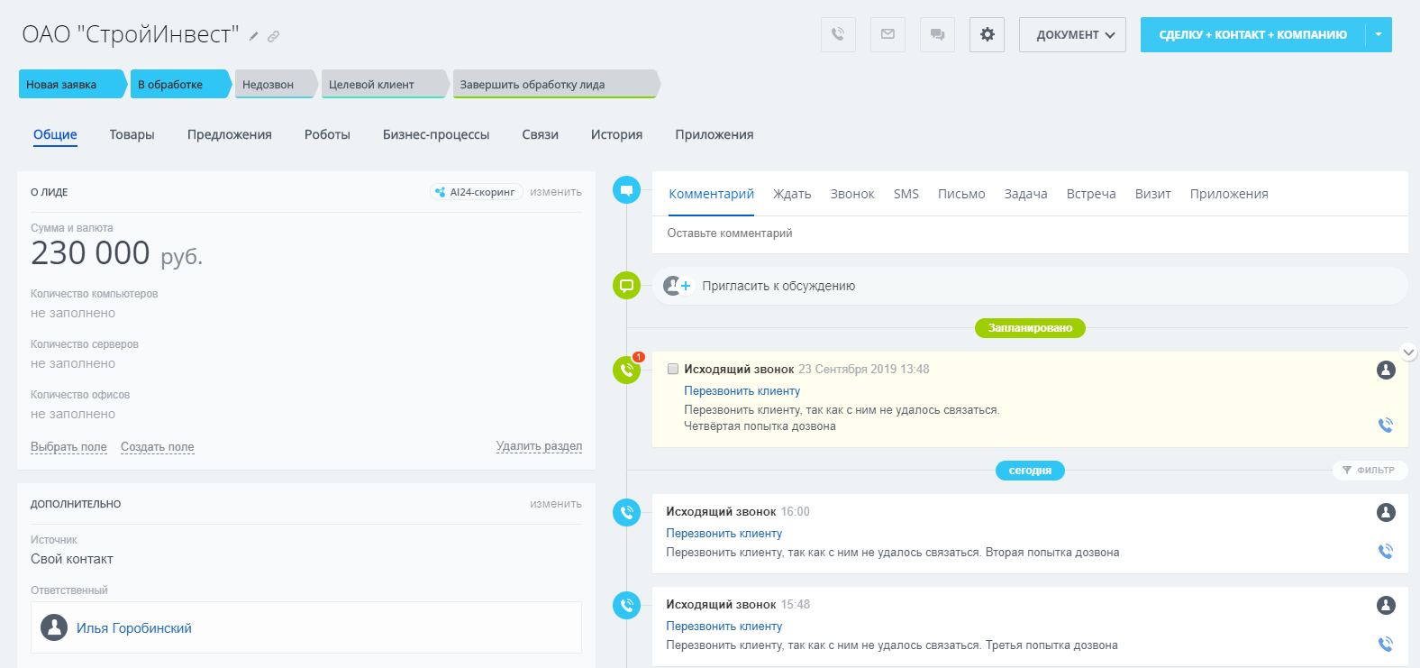 - Воронка Лидов: автоматическая постановка звонков при обработке воронки.