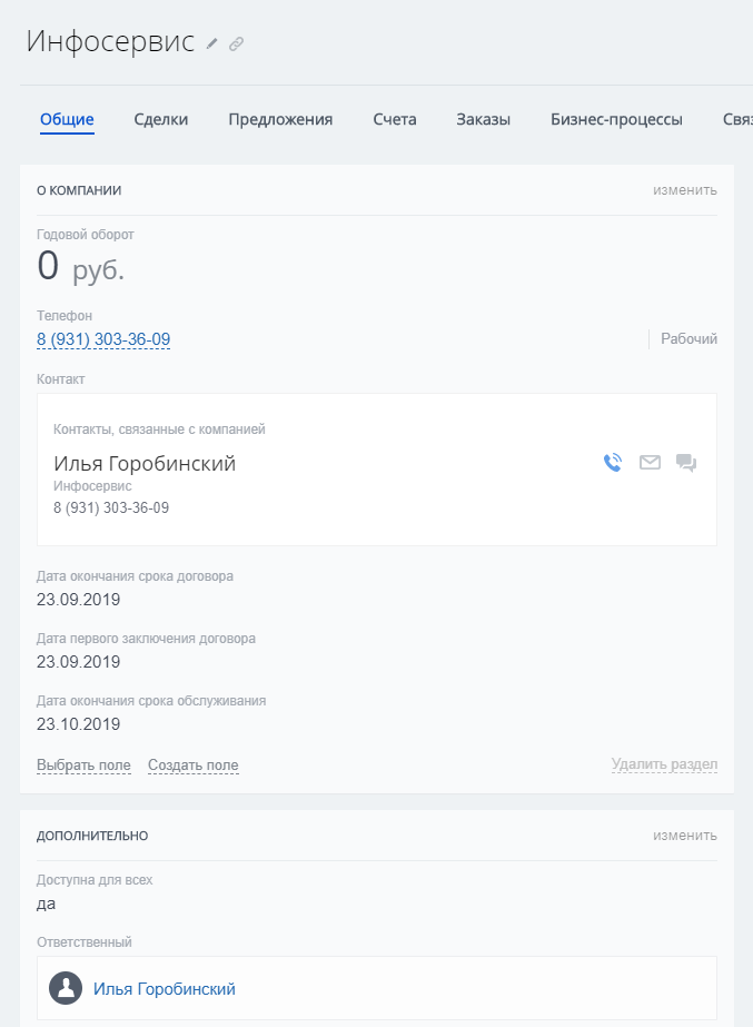 - Автоматическая запись в карточку Компании даты заключения договора, сроков окончания договора и обслуживания.