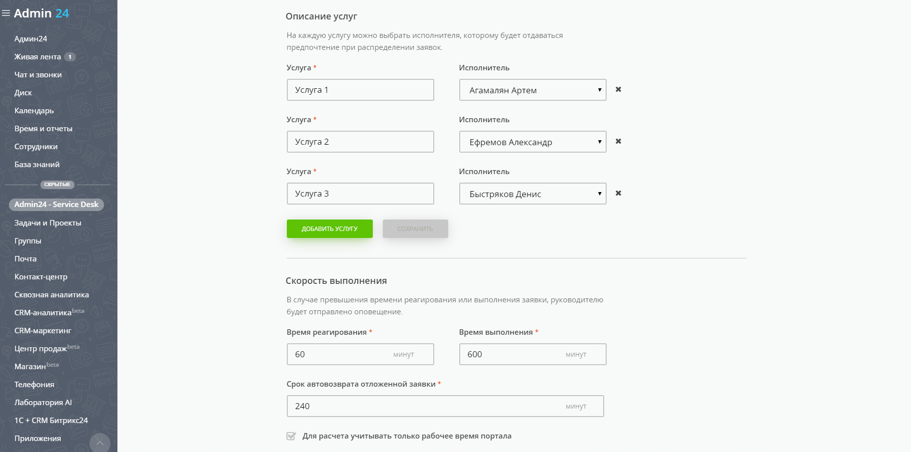 2. Сформируйте список услуг и исполнителей для них, чтобы заявки распределялись между исполнителями автоматически. Экономьте свое время.