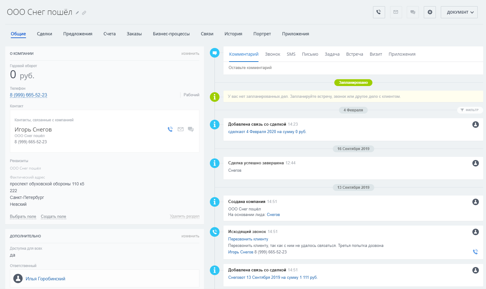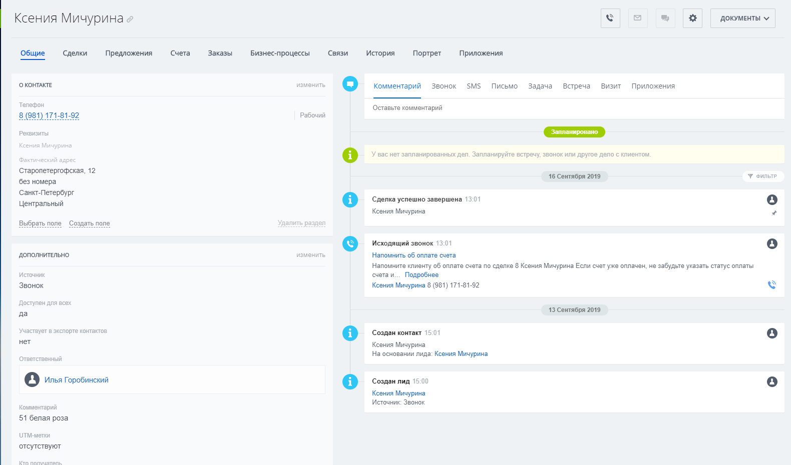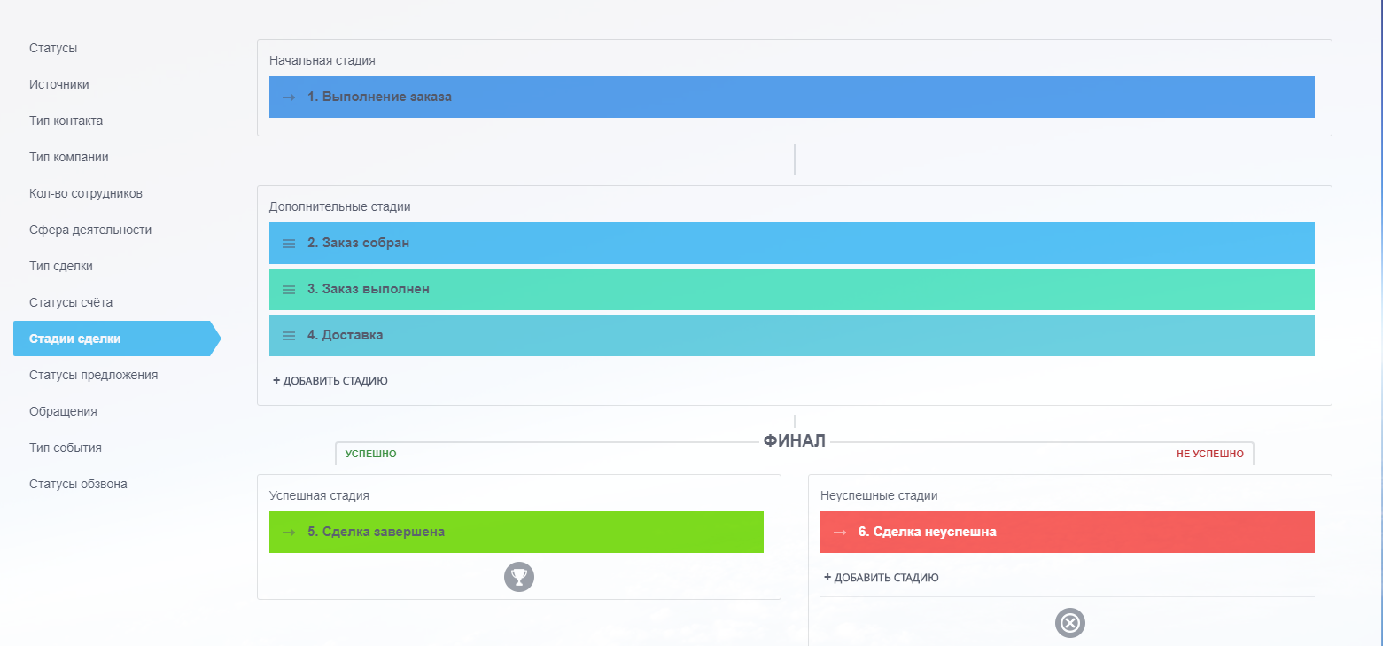 Для задач вашего бизнеса настроены стадии и воронка лидов, карточки лидов, стадии и воронка сделок, карточки сделок, контактов и компании.