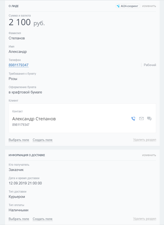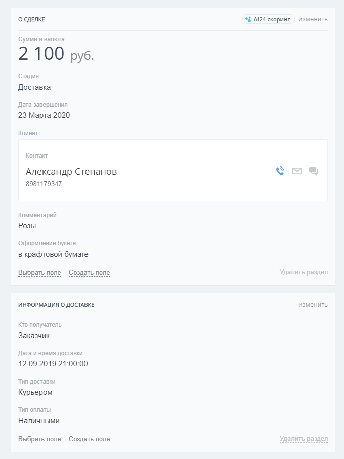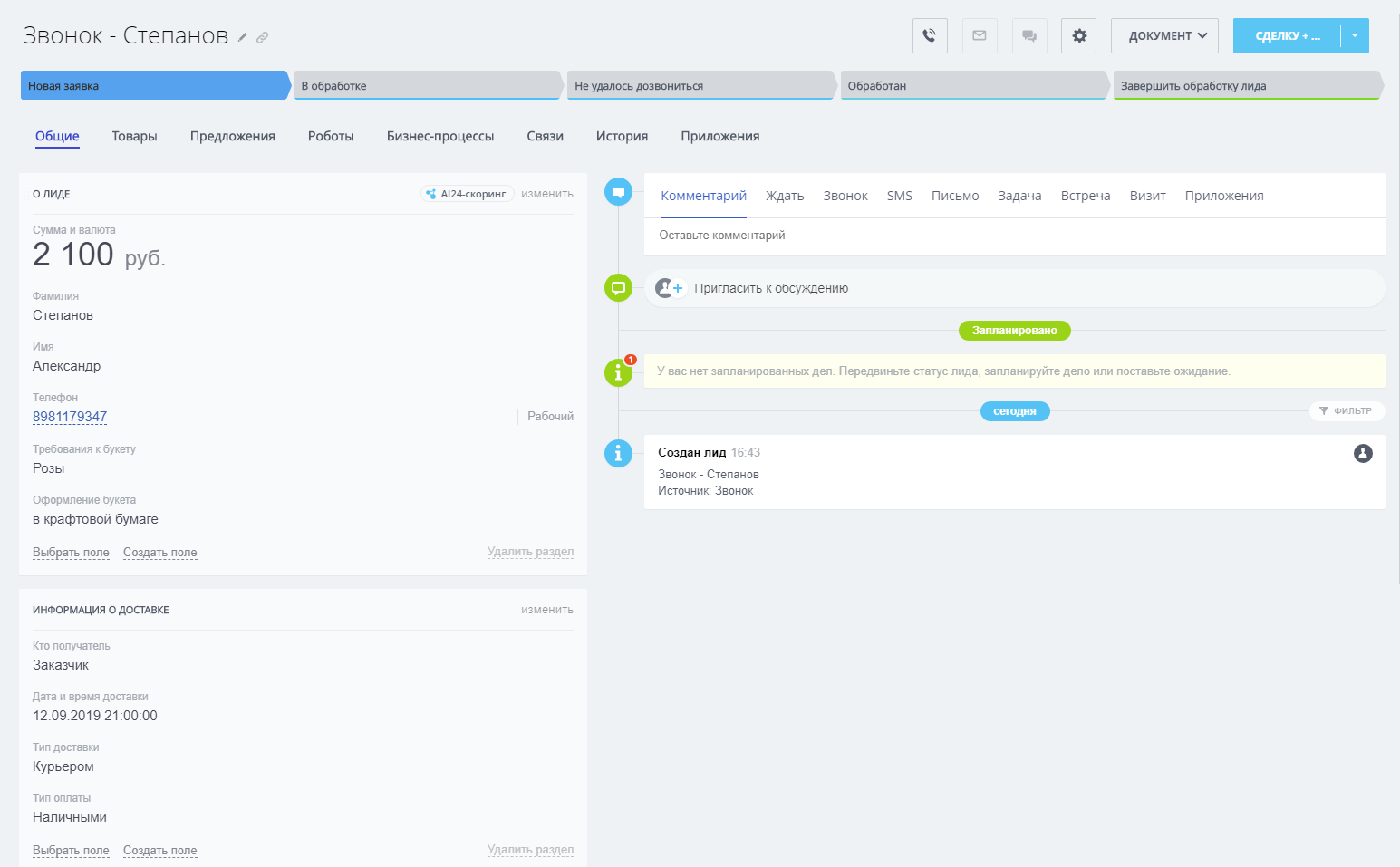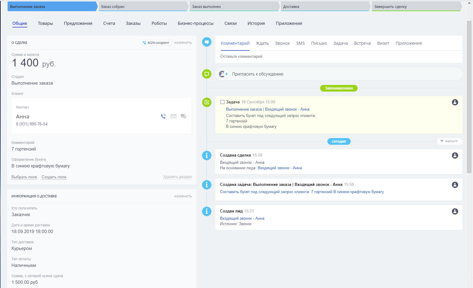 - Клиент обращается в компанию. Формируется сделка в CRM-системе, указываются пожелания к заказу, условия доставки и сумму оплаты.