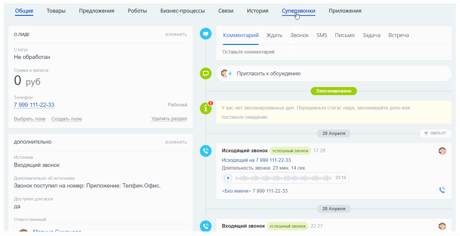 - Зайдите в карточку лида, сделки, компании или контакта. Там появится вкладка «Суперзвонки».