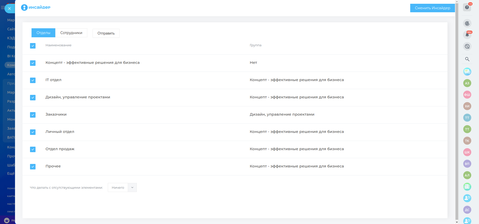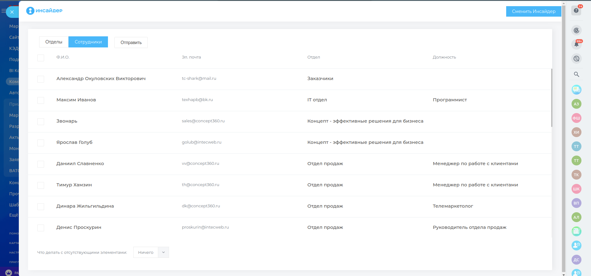 - Позволяет выгрузить (синхронизировать) структуру компании и сотрудников в панель управления Insider;