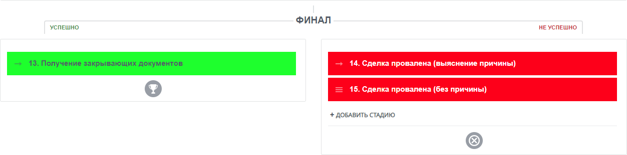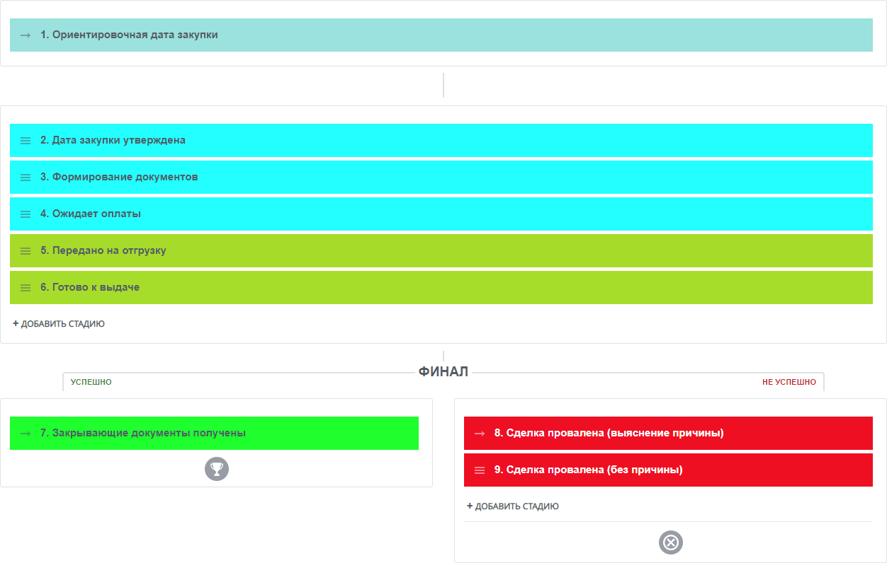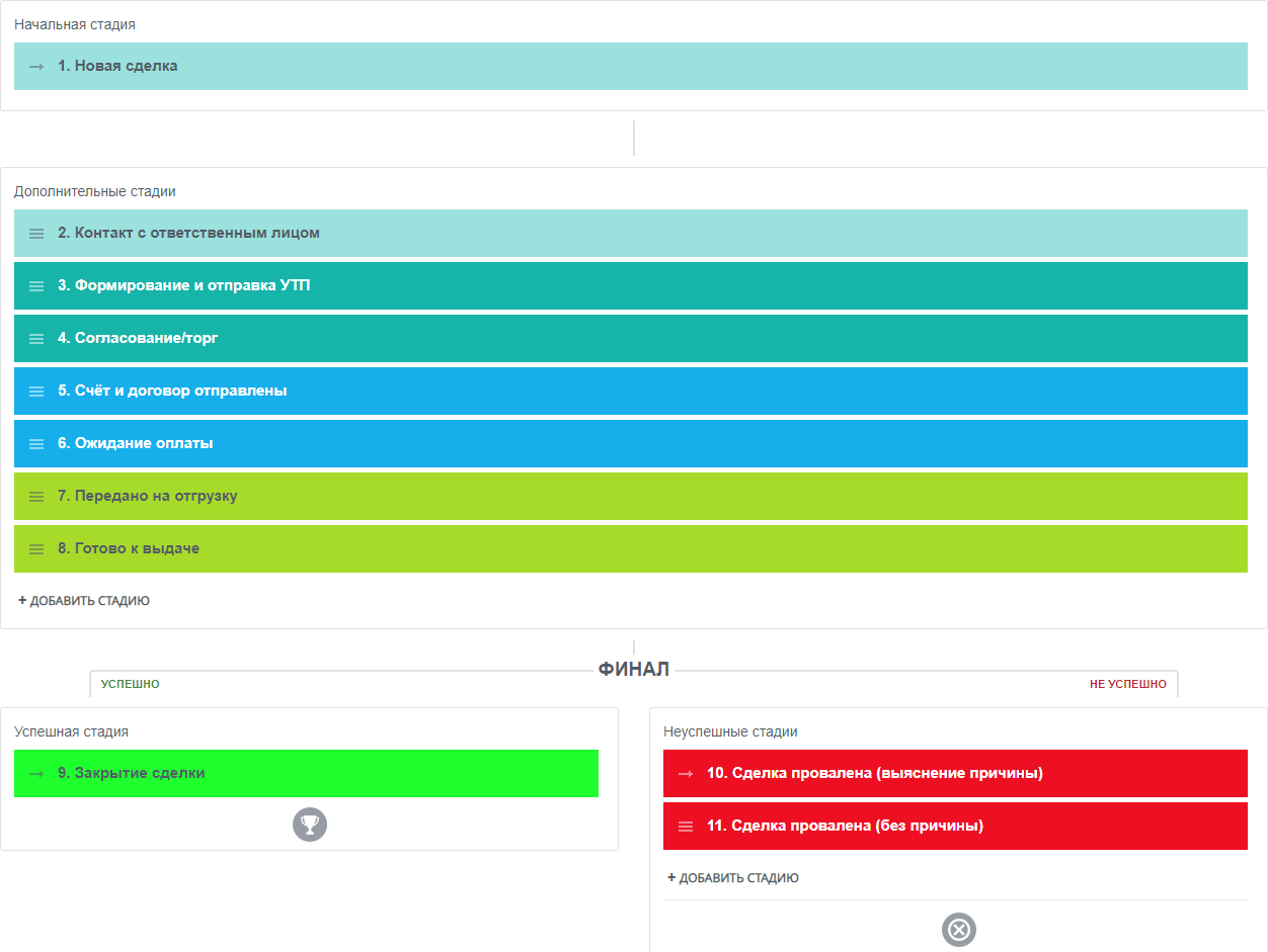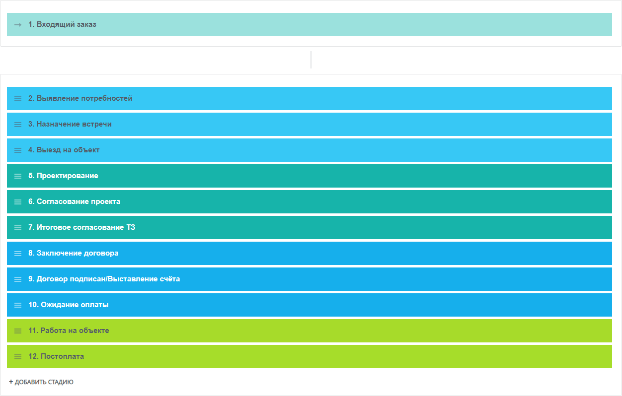 Каждое направление имеет стадии, позволяющие провести клиента от его потребностей до их удовлетворения. Использование разных воронок, позволяет оценить эффективность работы каждого направления компании по отдельности.