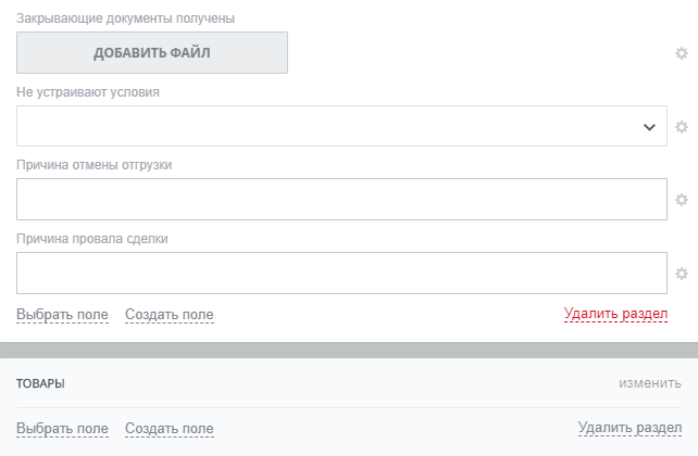 Менеджеру по продажам приходится обрабатывать огромное количество информации: лиды, сделки, взаимодействие с текущими клиентами. В такой ситуации легко запутаться, особенно если клиентов много. Поэтому для оптимизации работы менеджера мы настроили в отраслевой CRM поля на предмет их отображения и обязательности заполнения в зависимости от стадии (для лидов и сделок). Например, менеджер не сможет отправить сделку в отдел комплектации и доставки, пока не заполнит всю необходимую информацию о доставке. Каждое направление сделок имеет собственные разделы и поля, а также настройки отображения и обязательности заполнения в зависимости свойства от стадии.