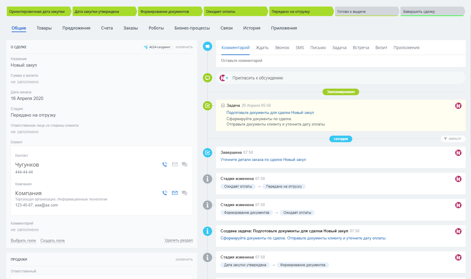 - автоматическая постановка задач и уведомлений сотрудникам в зависимости от стадии;