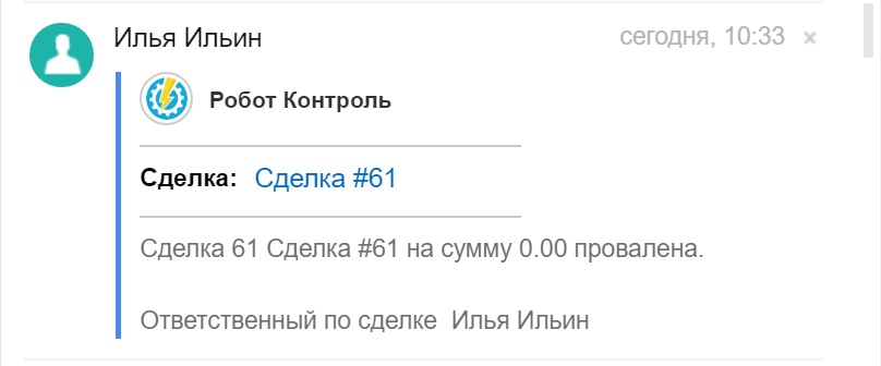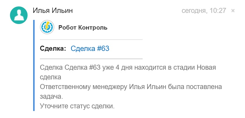 • Руководитель получит автоматическое уведомление в случае, если сделка зависла на одном из этапов.