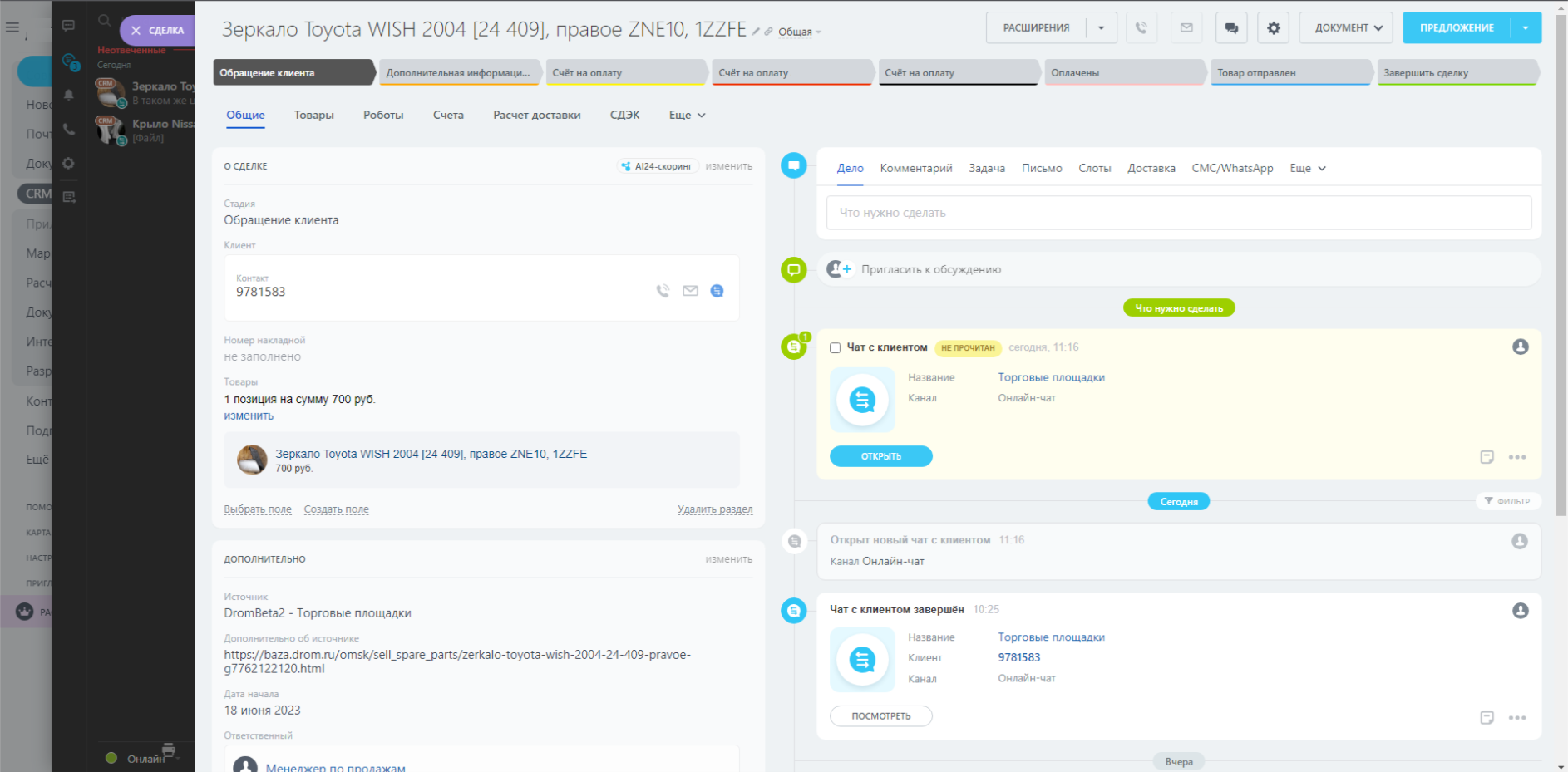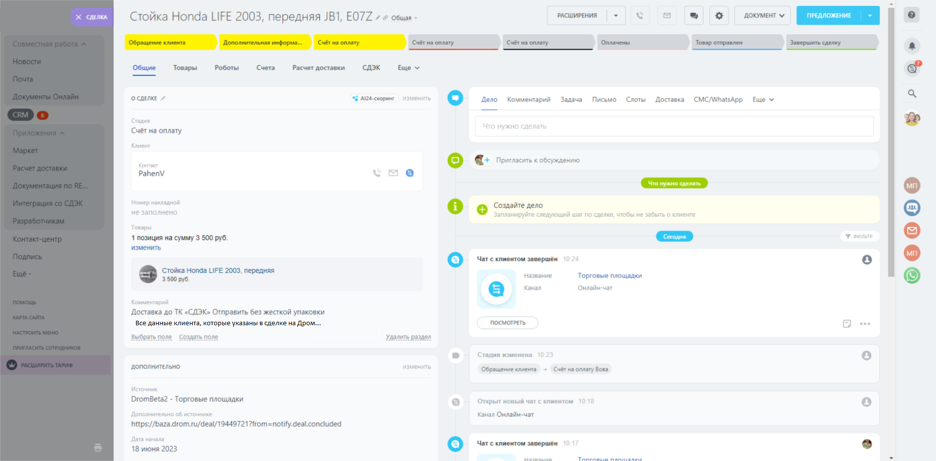 - Сделки. По каждой заключенной сделке на Дром создается сделка на портале Битрикс24, куда переносятся данные по отправке заказа и товары.