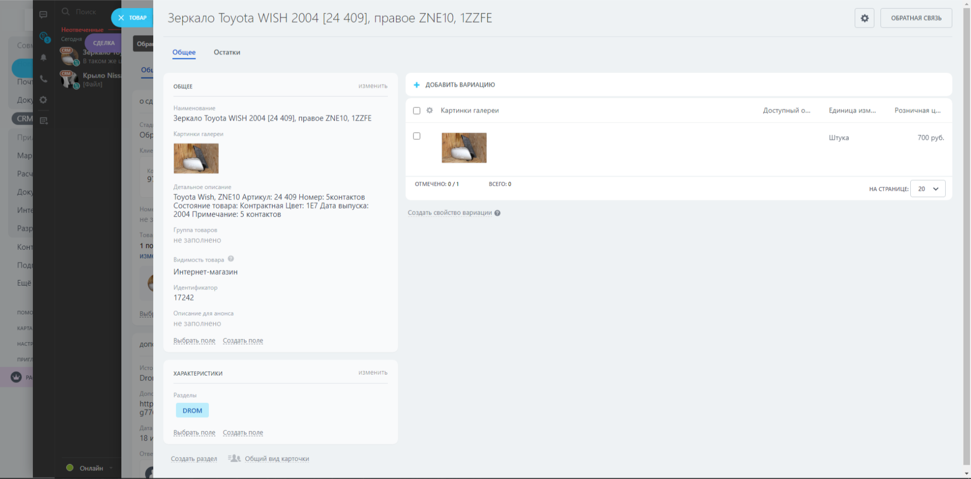 - Диалоги. По каждому диалогу на Дром создается сделка, в которую предается: товар по которому написал пользователь (картинка, название, описание), ссылка на объявление, ссылка на профиль пользователя, название сделки обновляется в соответствии с названием товара. При отправке нескольких изображений, отправка происходит одним сообщением.