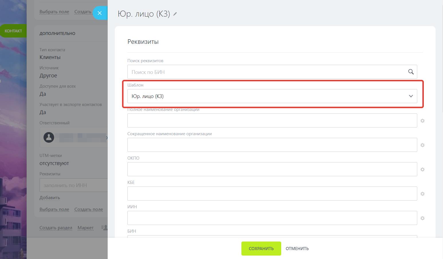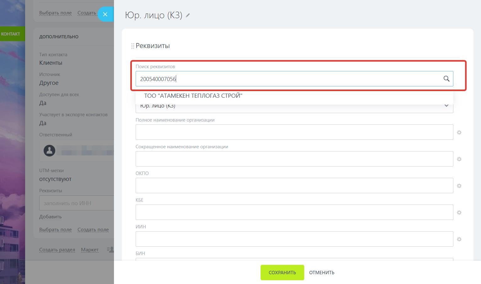 Заполнение реквизитов компании или контакта на основе данных с портала stat.gov.kz в один клик