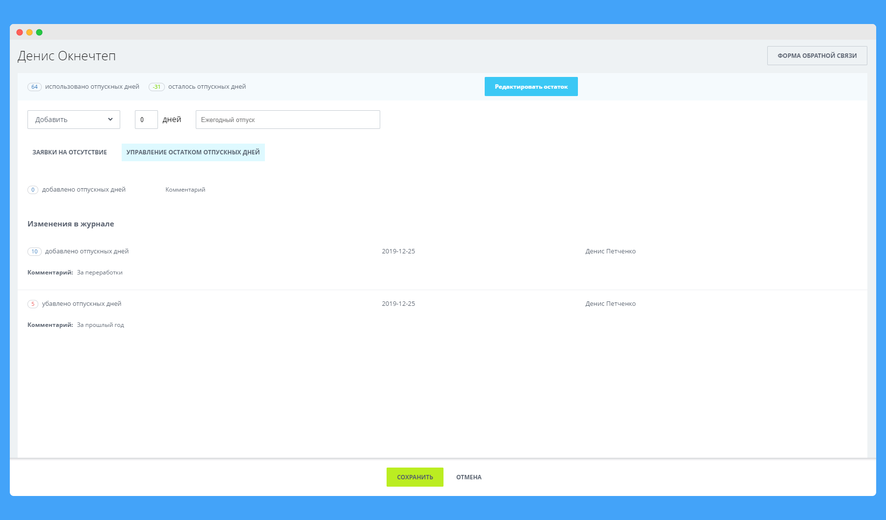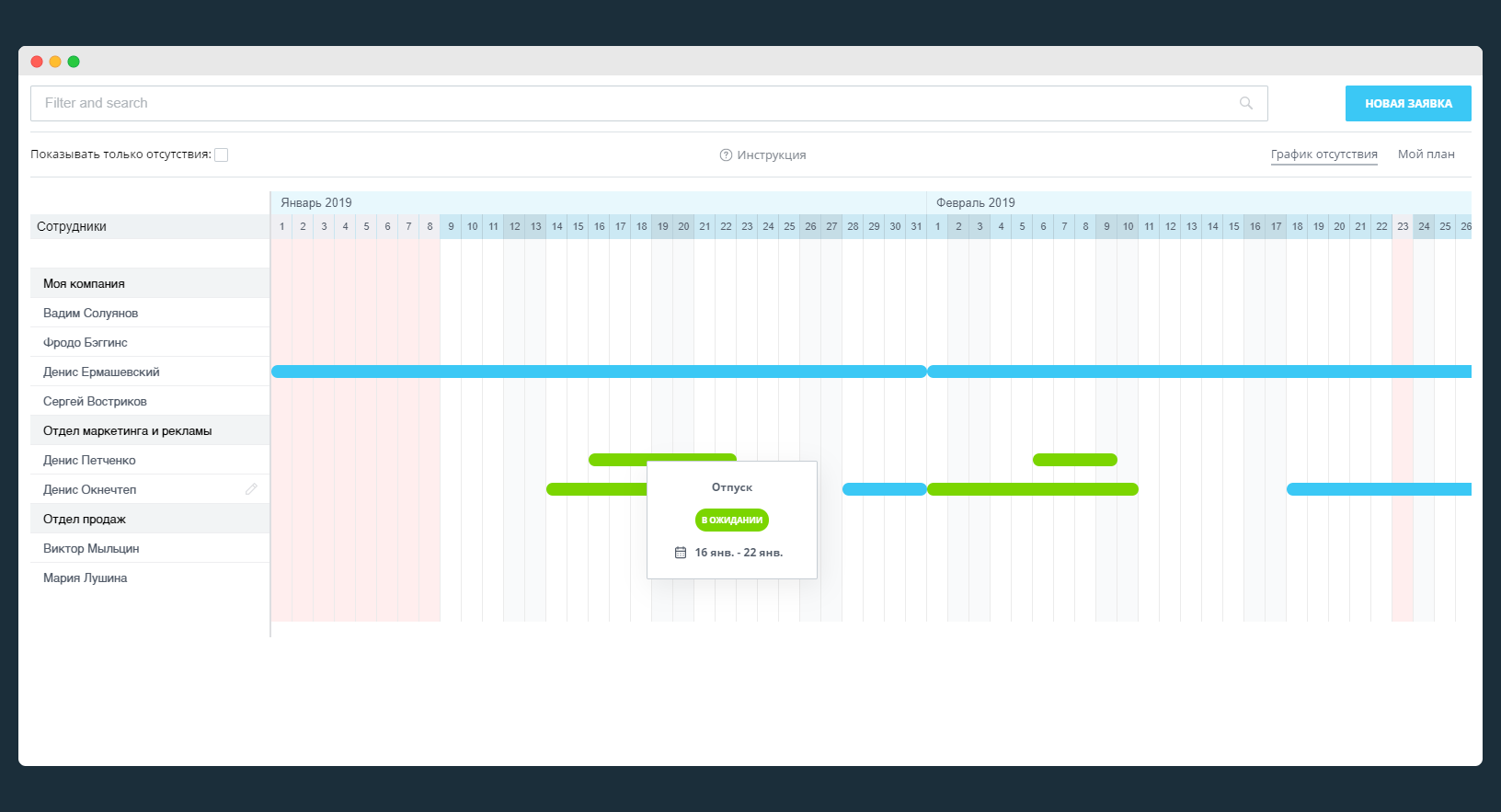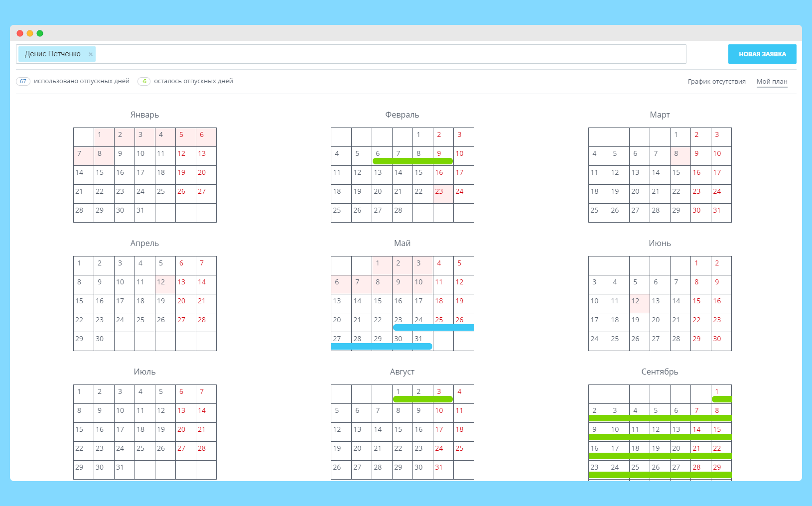 Вам доступно два формата отображения заявок на отсутствия: общий календарь компании и личный календарь каждого сотрудника. Также вам доступен полный журнал учёта заявок, в котором будут отображаться даты и статусы каждой заявки.