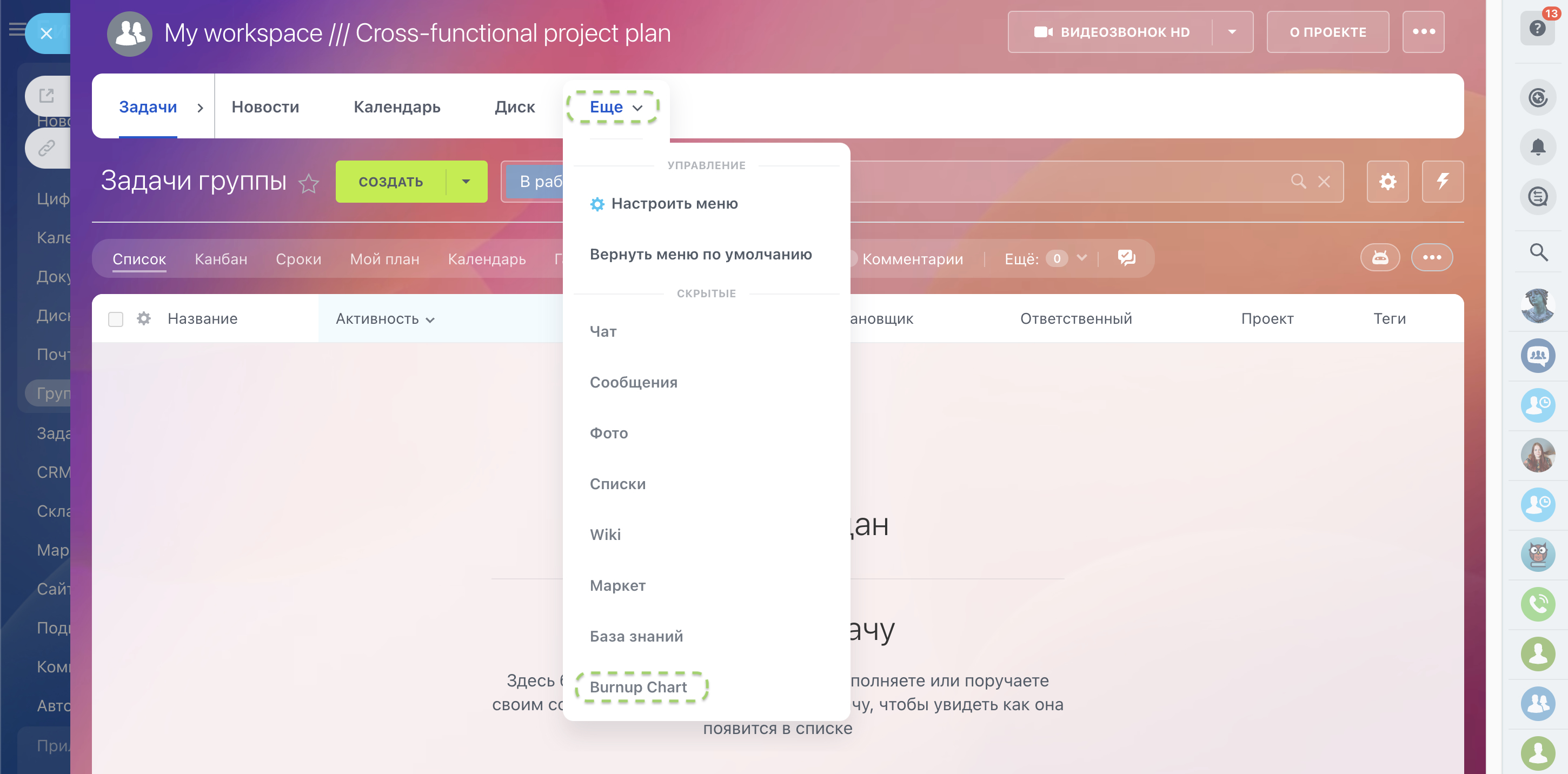 Приложение Burnup Chart предназначено для отслеживания предполагаемого времени завершения проекта. Теперь в любой момент вы можете просмотреть предполагаемое время завершения проекта, если у вас есть соответствующие права доступа к этому проекту. Само приложение запускается внутри рабочей группы.