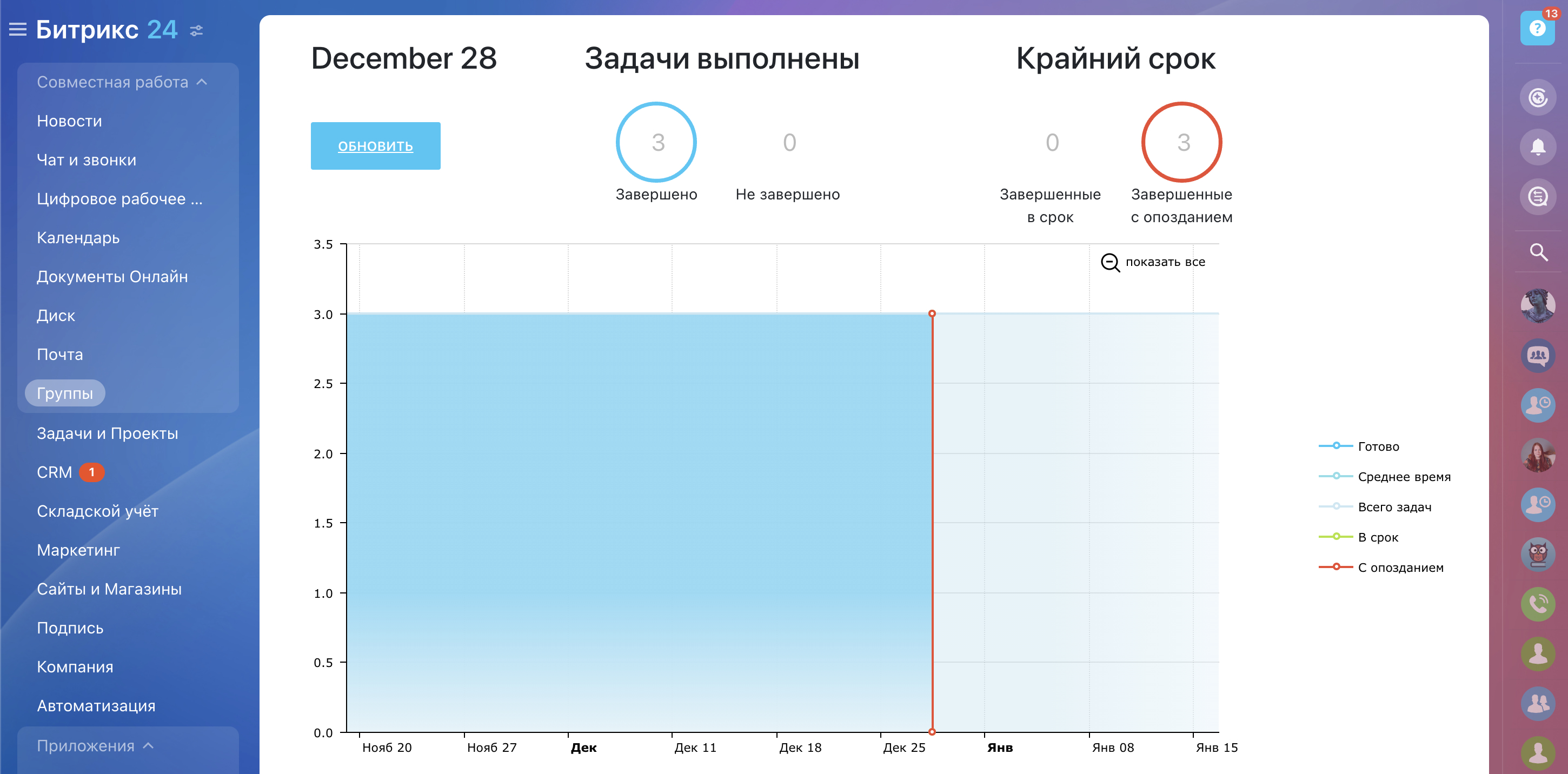 ○ В срок — показывает задачи, выполненные до установленного срока.